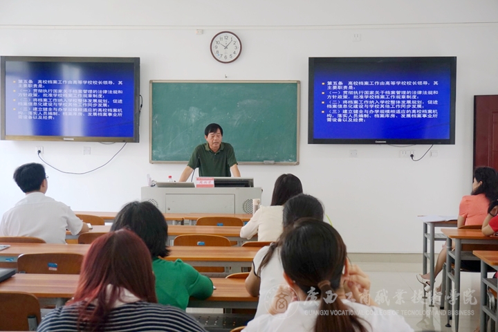 2015年9月23日上午,綜合檔案室邀請自治區(qū)檔案局經(jīng)濟科技檔案業(yè)務(wù)指導(dǎo)處原處長、調(diào)研員周興才同志到我校作了題為“高校檔案工作基本原則及檔案的收集歸檔”的檔案專題講座。學(xué)院辦公室主任蔣百平出席,講座由學(xué)院辦公室副主任高潔主持,學(xué)校檔案館籌備辦公室及綜合檔案室全體人員、各部門檔案工作的分管領(lǐng)導(dǎo)和兼職檔案員認(rèn)真聆聽講座。