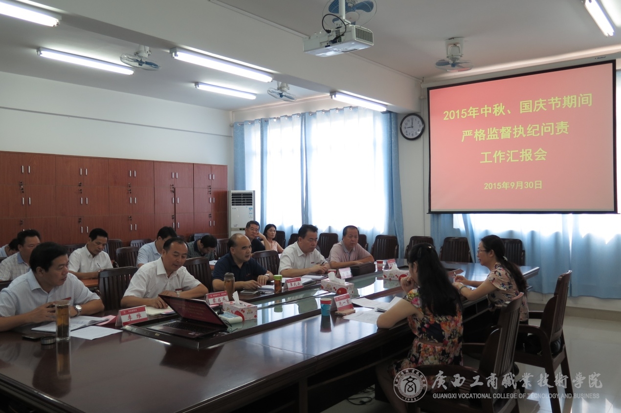 9月30日上午,關(guān)于2015年中秋、國慶節(jié)期間嚴格監(jiān)督執(zhí)紀問責工作匯報會在我院校本部教學(xué)樓2109會議室召開,自治區(qū)糧食局黨組成員、紀檢組組長歐澤馨和局機關(guān)黨委副調(diào)研員冼一紫參加工作匯報會,聽取2015年中秋、國慶節(jié)期間嚴格監(jiān)督執(zhí)紀問責工作的匯報,學(xué)院領(lǐng)導(dǎo)覃武云、陳杰、蒙啟成、李仕欽、李維,各黨政部門負責人、監(jiān)察審計室全體人員參加了會議。