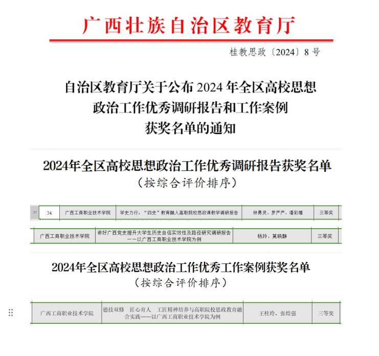林勇靈、羅嚴嚴、潘彩媚的《學史力行:“四史”教育融入高職院校思政課教學調(diào)研報告》和楊玲、莫曉靜的《講好廣西黨史提升大學生歷史自信實效性及路徑研究調(diào)研報告——以廣西工商職業(yè)技術學院為例》榮獲2024年全區(qū)高校思想政治工作優(yōu)秀調(diào)研報告三等獎。王桂玲、張煌強的《德技雙修 匠心育人 工匠精神培養(yǎng)與高職院校思政教育融合實踐——以廣西工商職業(yè)技術學院為例》榮獲2024年全區(qū)高校思想政治工作優(yōu)秀工作案例三等獎。