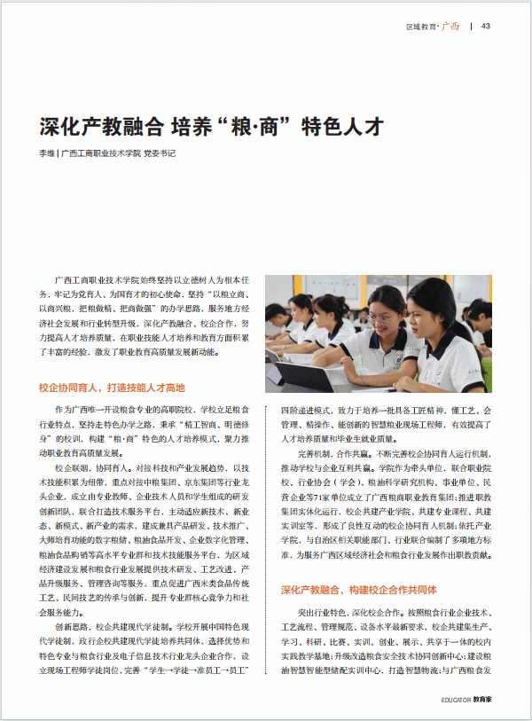 2024年3月出版的《教育家》雜志刊發(fā)學(xué)校黨委書記李維署名文章《夯實(shí)職業(yè)技能,育“糧·商”人才》,全文如下。