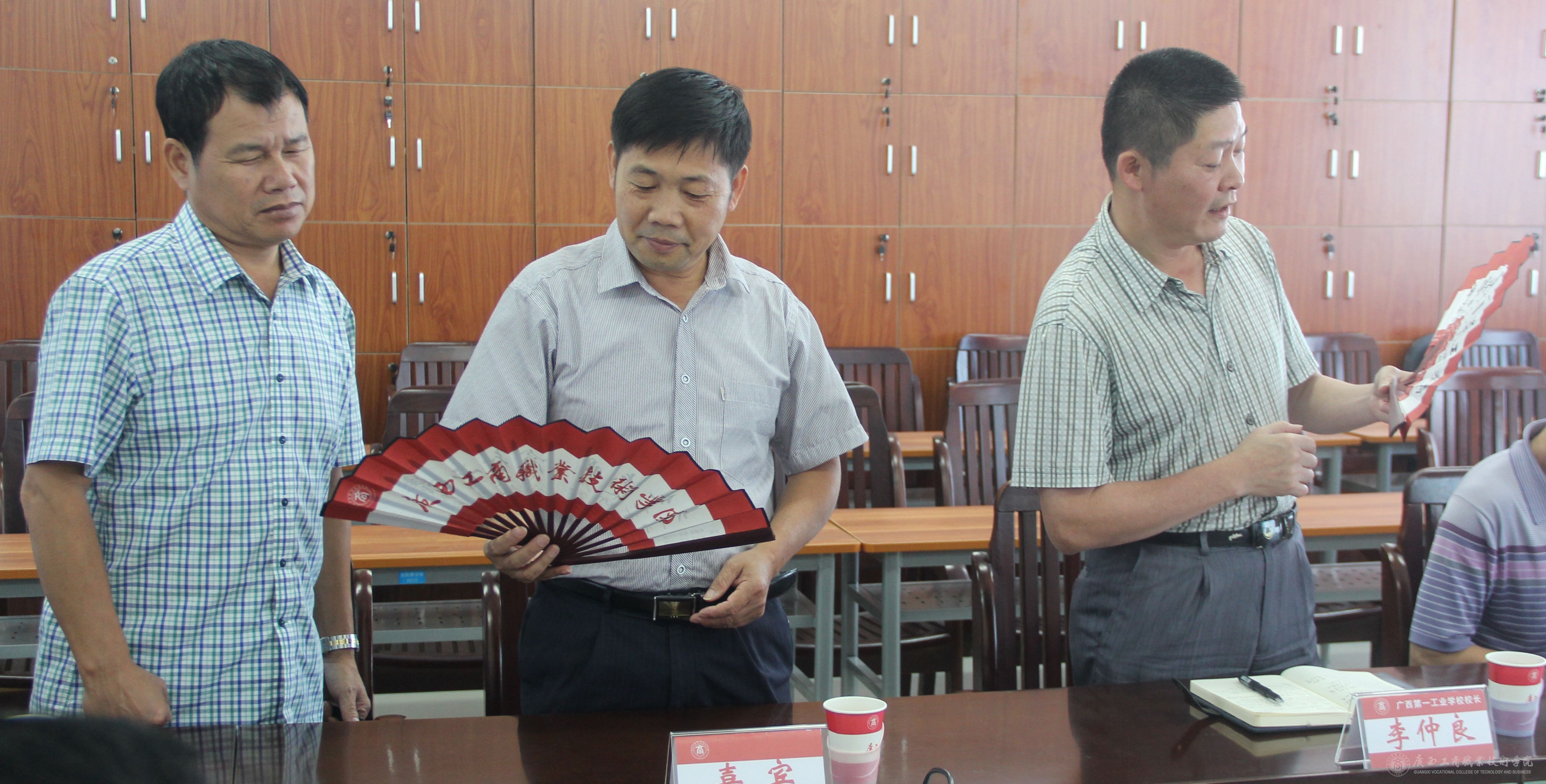 會議主要從建校經驗展開交流,雙方在校園建設、管理和應用等方面做了深入探討,分享了在建校上一些寶貴的經驗,促進了兩校之間的友好交流。最后,我院給廣西第一工業(yè)學校贈送了商院扇子作為紀念品。
