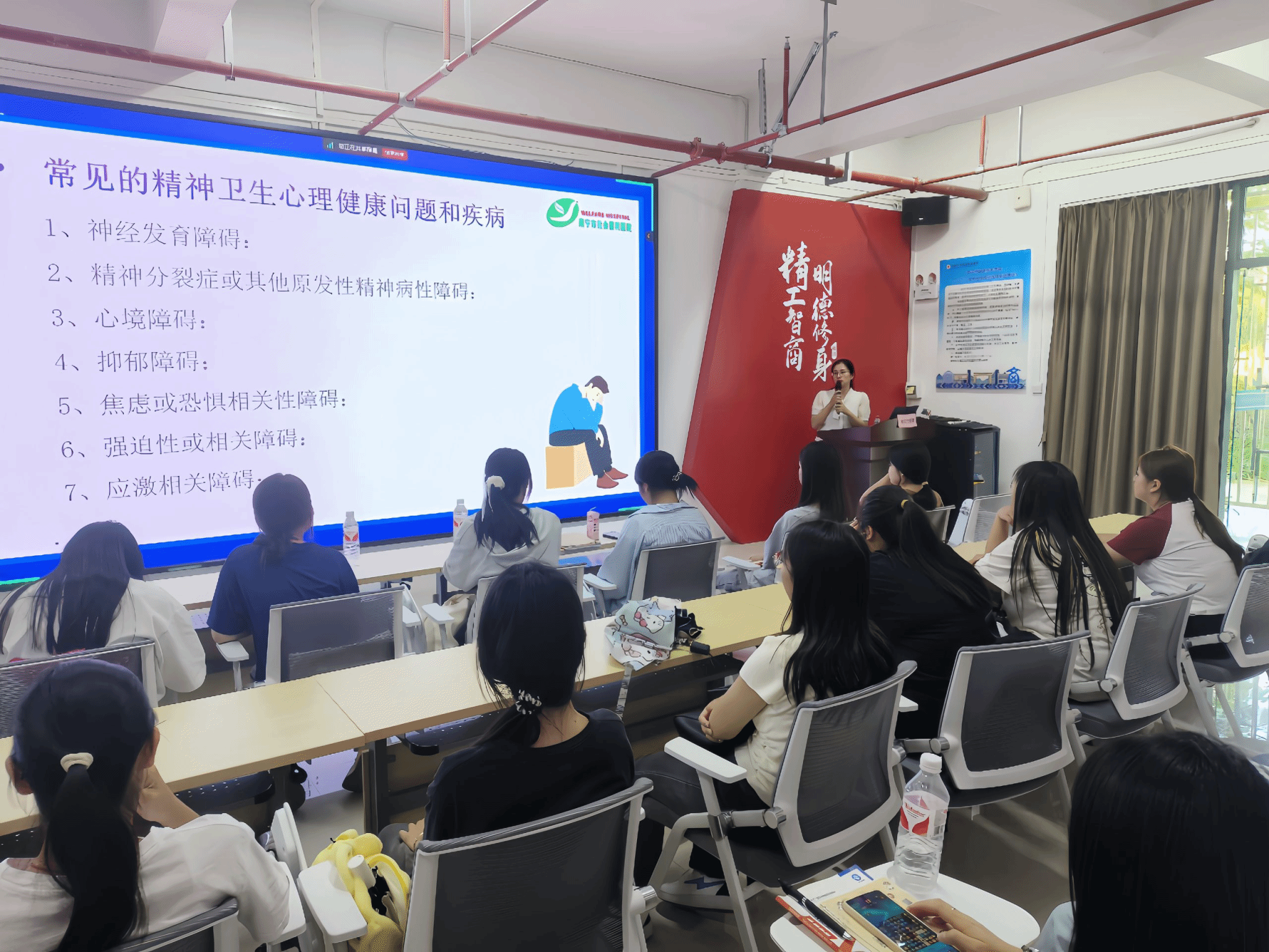 義診活動(dòng)共三部分,一是開展心理測(cè)量服務(wù),在場(chǎng)的資深心理醫(yī)生對(duì)師生的測(cè)量結(jié)果進(jìn)行了詳細(xì)解答;二是開展個(gè)性化心理咨詢服務(wù),心理醫(yī)生一對(duì)一與求助的師生溝通,認(rèn)真傾聽,情感關(guān)注,及時(shí)解答師生關(guān)于心理健康方面的疑惑。三是開展心理健康知識(shí)講座,心理醫(yī)生圍繞師生關(guān)注度較高的話題開展主題為《精神衛(wèi)生知多少》的講座,為廣大師生普及心理健康知識(shí)。