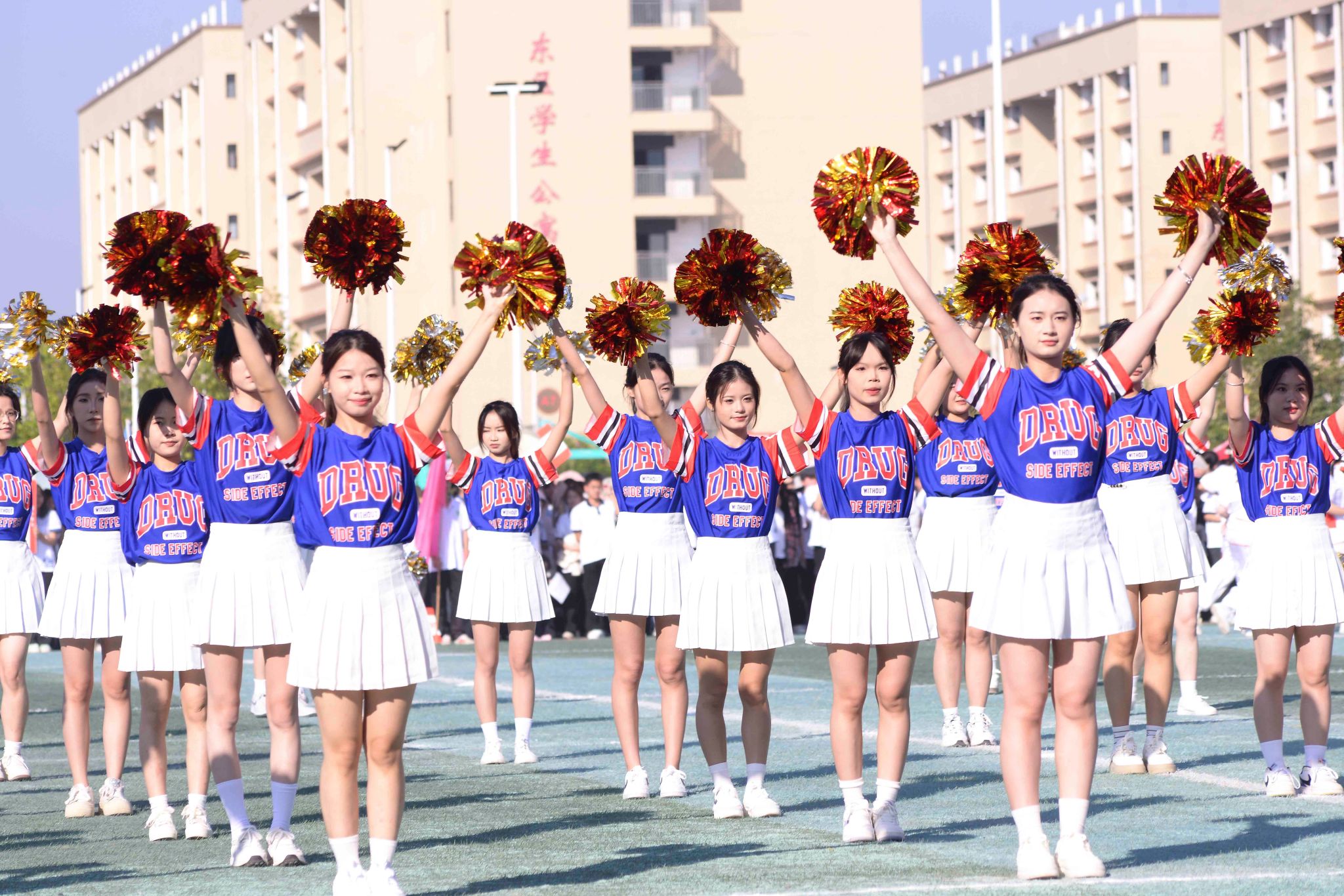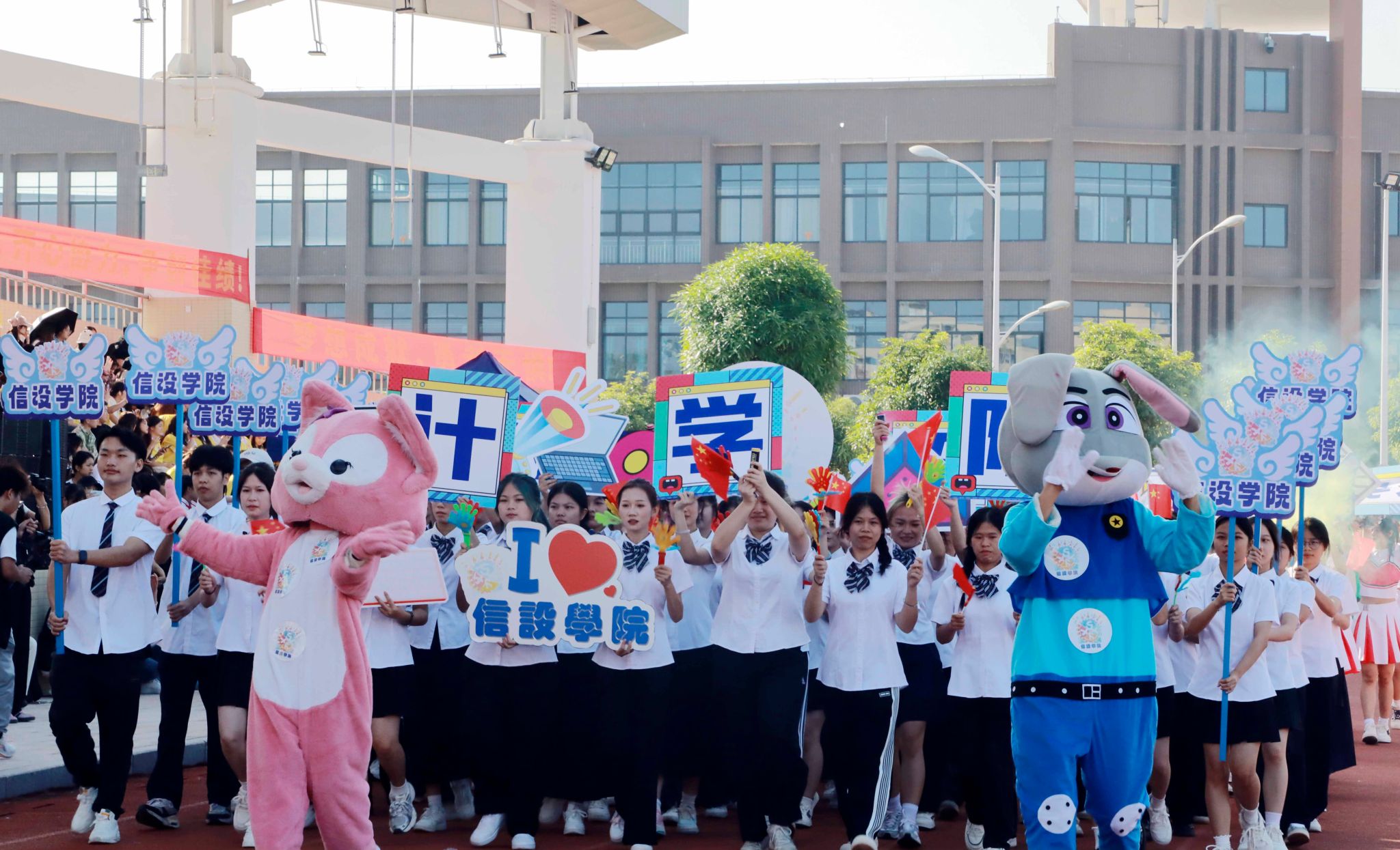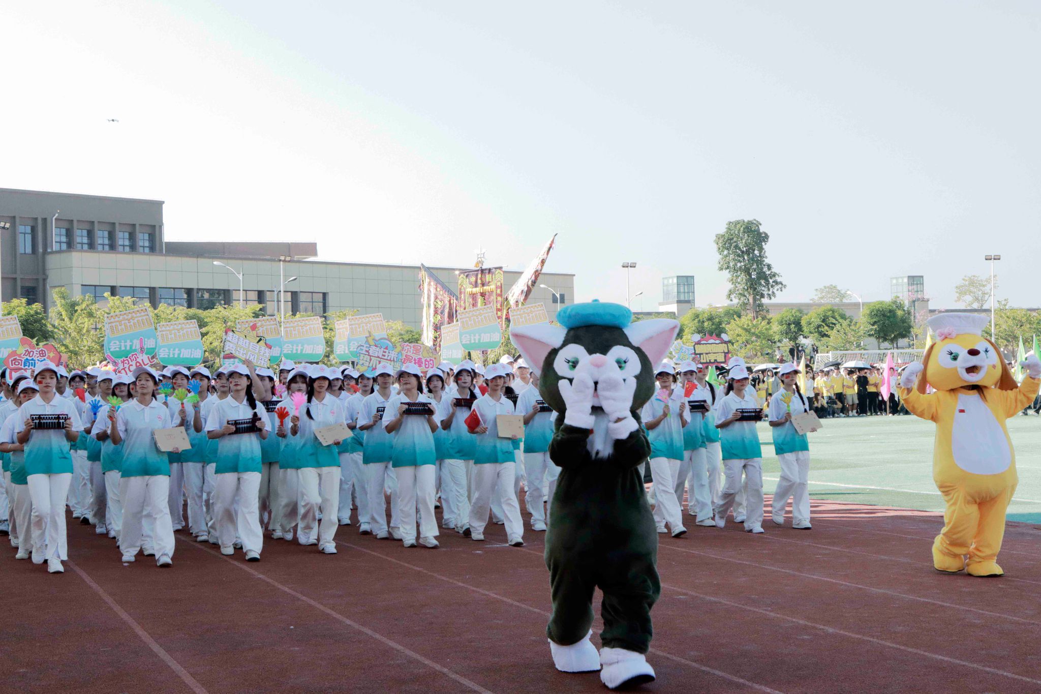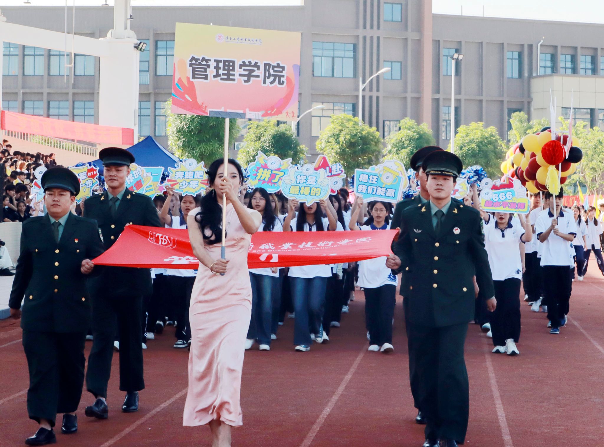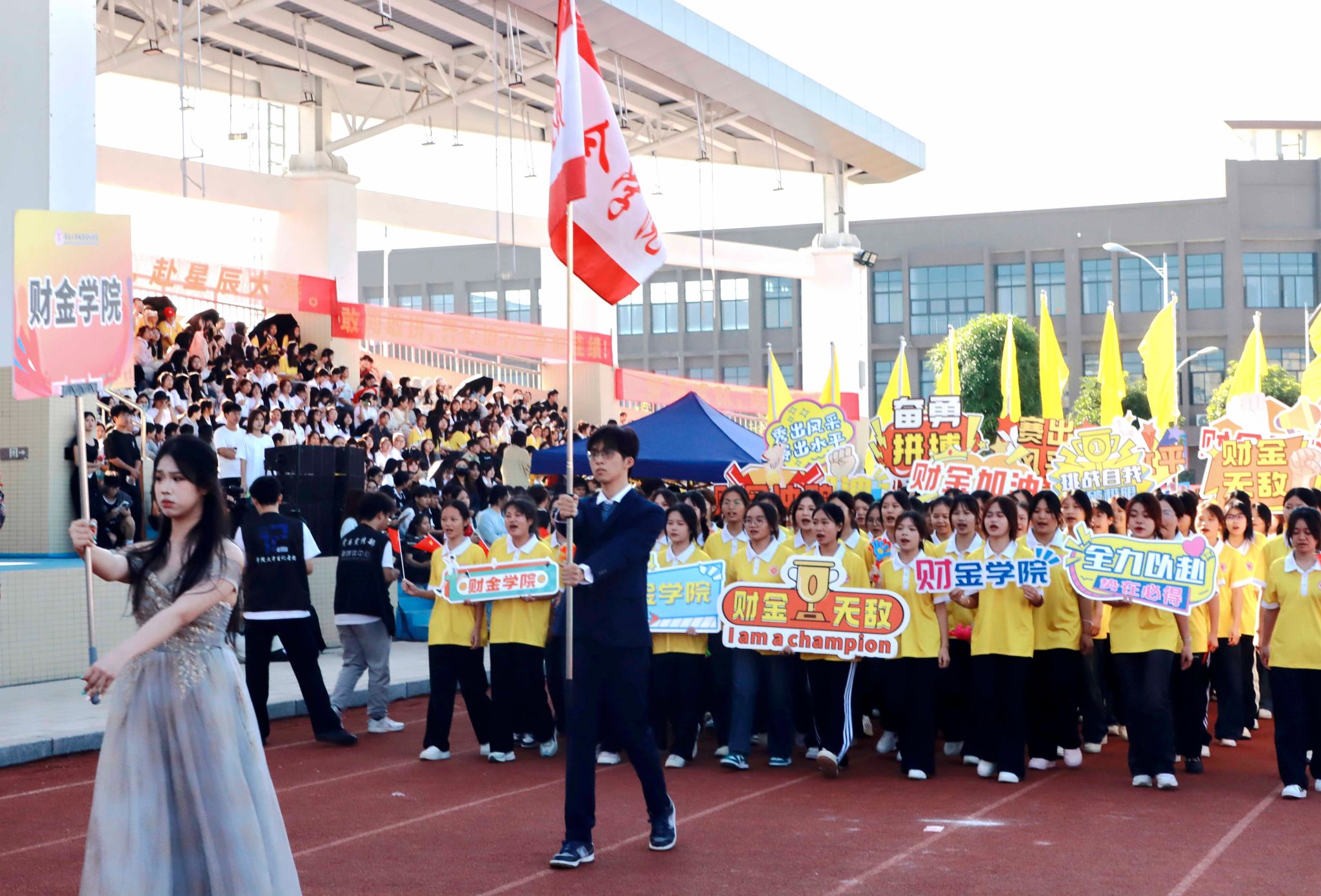 鑼鼓喧天,龍騰虎躍,來自學(xué)校武術(shù)協(xié)會的精彩舞龍舞獅表演拉開了本屆校運會的序幕。緊接著,由百名同學(xué)帶來的團體操表演點燃了現(xiàn)場的熱烈氣氛。在雄壯的進行曲中,國旗隊、校旗隊、會旗隊以及各二級學(xué)院方塊隊和裁判員方塊隊依次邁著堅定的步伐入場。隊伍浩浩蕩蕩,秩序井然,觀眾席上掌聲雷動,歡呼聲此起彼伏,為這場運動盛事增添了無限熱情。在這充滿激情的氛圍里,各二級學(xué)院的方塊隊以充滿創(chuàng)意和獨特風(fēng)格的造型,充分展現(xiàn)了廣商學(xué)子們的青春風(fēng)采,也很好展示了運動健兒們不懼困難、敢于挑戰(zhàn)的精神風(fēng)貌。