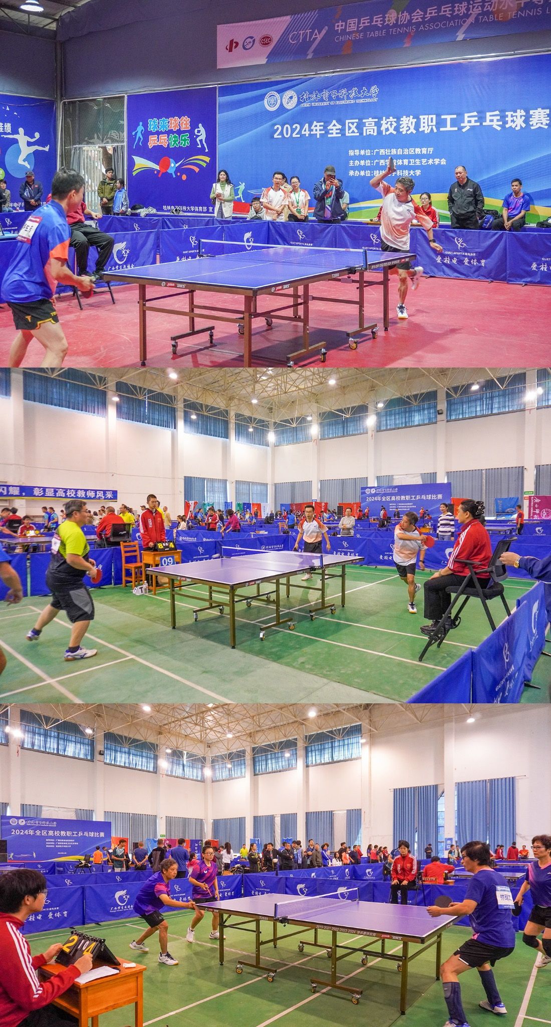 2024年全區(qū)高校教職工乒乓球比賽于11月4日—8日在桂林電子科技大學火熱開戰(zhàn),來自全區(qū)共35支高校隊伍近532名運動員、教練員參賽。本次比賽指導單位為自治區(qū)教育廳,由廣西體育衛(wèi)生學術學會主辦,桂林電子科技大學承辦。學校校長劉進擔任領隊率隊參加比賽,學校黨委副書記安仲文擔任教練兼隊員。