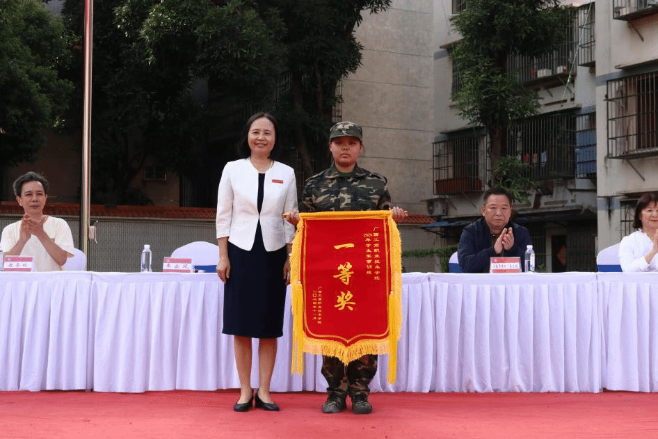 軍訓(xùn)匯演結(jié)束后,良慶區(qū)人民武裝部領(lǐng)導(dǎo)宣布會(huì)操結(jié)果。學(xué)校領(lǐng)導(dǎo)、良慶區(qū)人民武裝部領(lǐng)導(dǎo)、各二級(jí)學(xué)院有關(guān)負(fù)責(zé)人為獲獎(jiǎng)班級(jí)頒發(fā)錦旗。