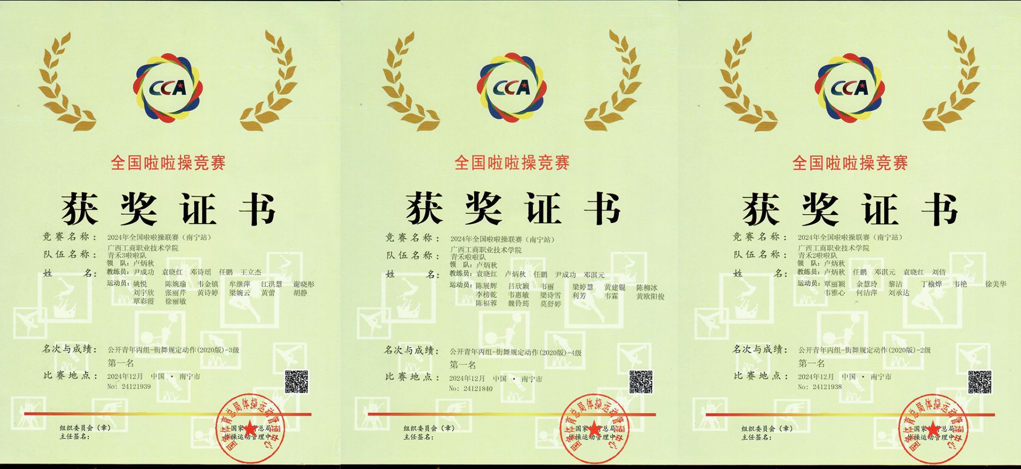2024年12月6日-8日,由國家體育總局體操管理中心、中國蹦床與技巧協(xié)會主辦,廣西社會體育運動中心、廣西學校體育衛(wèi)生藝術學會承辦的2024年全國啦啦操聯(lián)賽(南寧站)在廣西建設職業(yè)技術學院舉行,來自廣西區(qū)內(nèi)外386支參賽隊同臺競技。我校盧炳秋、尹成功、袁曉紅、劉倩、任鵬、鄧淇元等6位教師指導的三支參賽隊伍獲得公開青年丁組集體街舞規(guī)定動作2級、3級、4級三個賽項第一名的優(yōu)異成績。