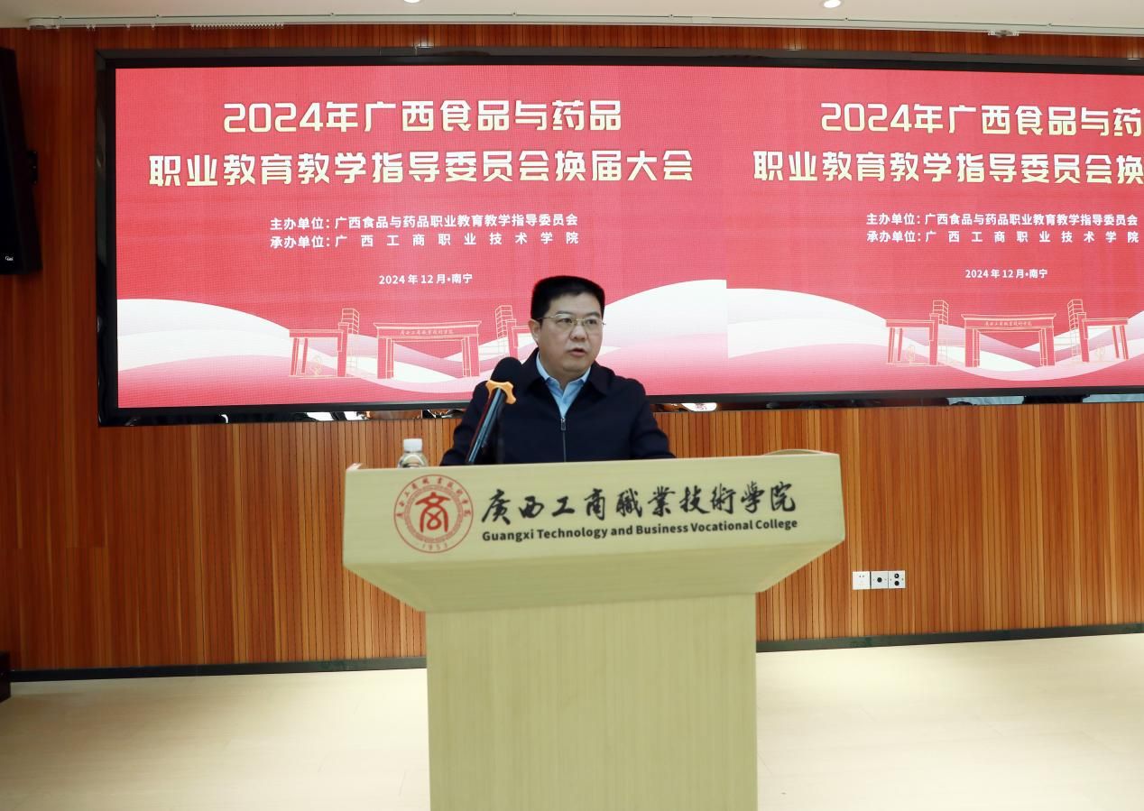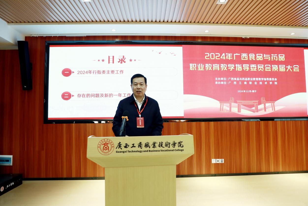 學(xué)校黨委書記、廣西食品與藥品行指委副主任委員李維作廣西食品藥品專業(yè)教育教學(xué)指導(dǎo)委員會(huì)2024年工作總結(jié)及2025年工作計(jì)劃。他表示,在自治區(qū)教育廳、自治區(qū)工信廳的領(lǐng)導(dǎo)下,廣西食品與藥品行指委統(tǒng)籌各成員單位積極配合,今年圓滿完成了行指委工作計(jì)劃和行動(dòng)計(jì)劃提出的階段性任務(wù),教育教學(xué)質(zhì)量顯著提升。李維指出,新一屆行指委將緊緊圍繞國家深化教育教學(xué)改革決策部署,切實(shí)推動(dòng)食品藥品職業(yè)教育取得新成效。一是進(jìn)一步加強(qiáng)工作信息報(bào)告機(jī)制,完善行指委委員的工作職責(zé),促進(jìn)各單位建設(shè)經(jīng)驗(yàn)交流。二是要做好頂層設(shè)計(jì),打造高水平專業(yè)群;加強(qiáng)校企合作,建設(shè)一流核心課程;完善管理機(jī)制,校企雙元開發(fā)新形態(tài)教材;進(jìn)培養(yǎng)結(jié)合,建設(shè)高水平雙師隊(duì)伍;深化產(chǎn)教融合,打造行業(yè)產(chǎn)教融合共同體;推動(dòng)職教出海,為“一帶一路”建設(shè)獻(xiàn)“糧”策。