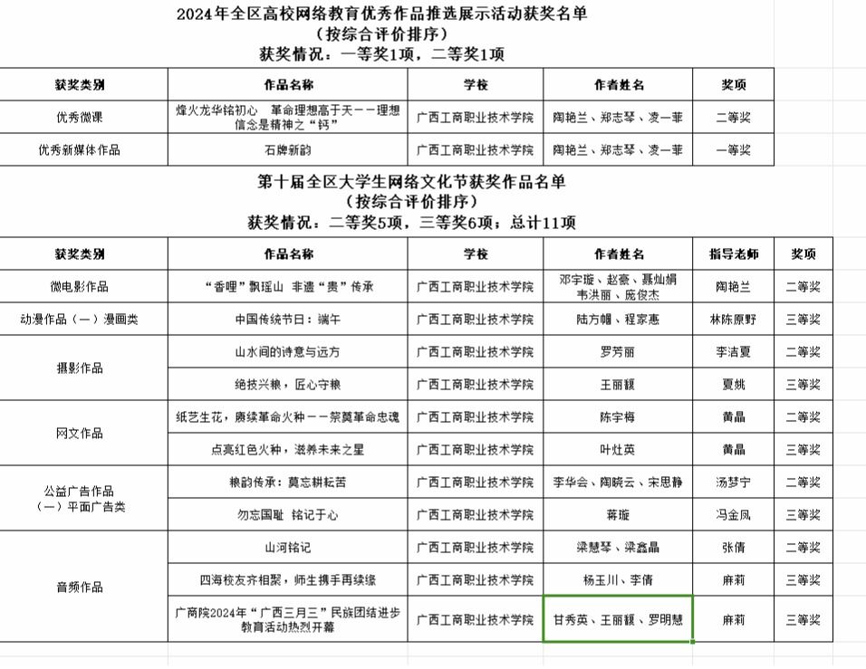 近日,自治區(qū)教育廳和自治區(qū)黨委網(wǎng)信辦公布第十屆全區(qū)大學(xué)生網(wǎng)絡(luò)文化節(jié)和2024年全區(qū)高校網(wǎng)絡(luò)教育優(yōu)秀作品推選展示活動(dòng)獲獎(jiǎng)名單,我校在優(yōu)秀微課、優(yōu)秀新媒體作品、微電影、漫畫(huà)、攝影、網(wǎng)文、公益廣告、音頻等8類(lèi)作品的征集中榮獲13個(gè)獎(jiǎng)項(xiàng),其中一等獎(jiǎng)1個(gè)、二等獎(jiǎng)6個(gè)、三等獎(jiǎng)6個(gè)。