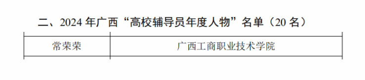 近日,2024年廣西“最美高校輔導(dǎo)員”暨“高校輔導(dǎo)員年度人物”推選展示活動結(jié)果揭曉。我校教師常榮榮獲評2024年廣西“高校輔導(dǎo)員年度人物”。