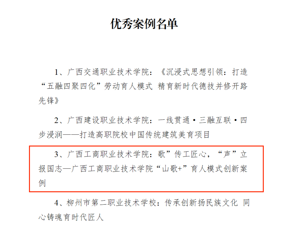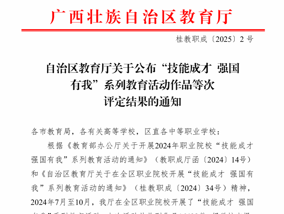 近日,自治區(qū)教育廳公布了2024年全區(qū)“技能成才 強(qiáng)國有我”系列教育活動作品等次評定結(jié)果,我校在此次活動中表現(xiàn)優(yōu)異,共推薦319項(xiàng)作品和2個典型案例入圍區(qū)賽。經(jīng)過激烈角逐,我校斬獲佳績:34項(xiàng)作品榮獲一等獎,68項(xiàng)作品榮獲二等獎,105項(xiàng)作品榮獲三等獎,《“歌”傳工匠心,“聲”立報國志——廣西工商職業(yè)技術(shù)學(xué)院“山歌+”育人模式創(chuàng)新案例》榮獲優(yōu)秀典型案例。此外,學(xué)校還榮獲優(yōu)秀組織獎,充分展現(xiàn)了我校在技能教育和人才培養(yǎng)方面的成果。