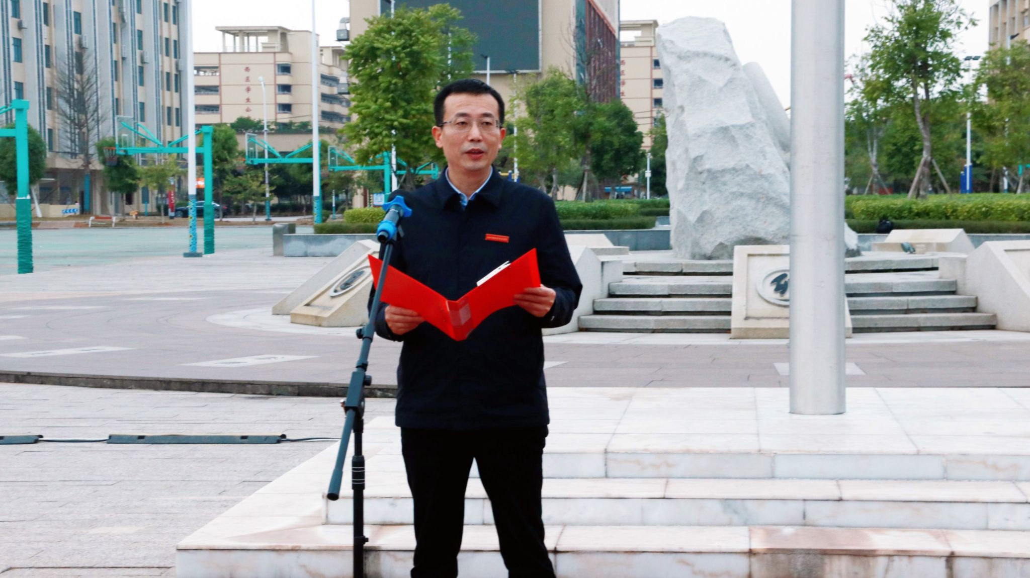 在雄壯的國歌聲中,五星紅旗冉冉升起,全體師生肅立注目,表達對祖國的崇高敬意。