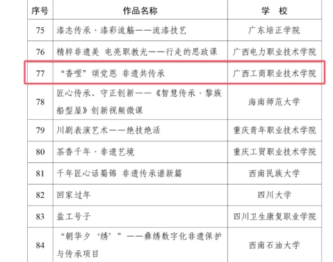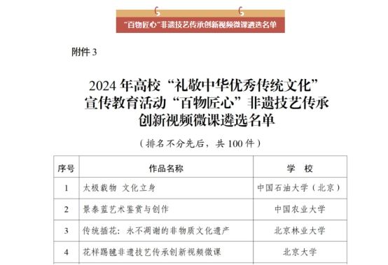 近日,教育部辦公廳公布了2024年高?!岸Y敬中華優(yōu)秀傳統(tǒng)文化”宣傳教育活動優(yōu)秀作品名單,我校報(bào)送的作品《“香哩”頌黨恩 非遺共傳承》入選“百物匠心”非遺技藝傳承創(chuàng)新視頻微課名單。該作品后續(xù)將通過央視網(wǎng)、新華網(wǎng)、中國教育發(fā)布等平臺進(jìn)行專題宣傳展示。