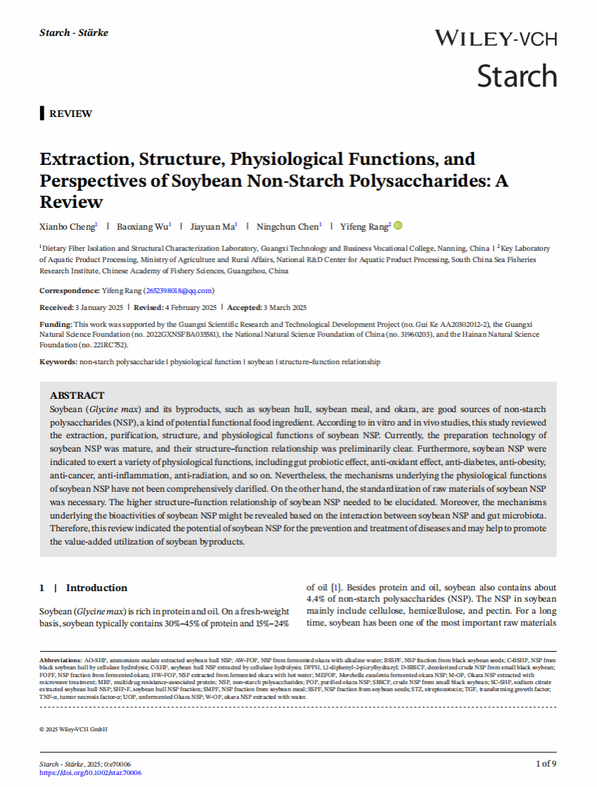 近日,學(xué)校成顯波專家工作室在國際知名期刊《Starch - St?rke》上發(fā)表了題為《Extraction, Structure, Physiological Functions, and Perspectives of Soybean Non-Starch Polysaccharides》的文章。該研究系統(tǒng)總結(jié)了大豆及其副產(chǎn)品中非淀粉多糖(NSP)的提取技術(shù)、結(jié)構(gòu)特性及生理功能,并展望了其在功能食品與醫(yī)藥領(lǐng)域的應(yīng)用潛力。