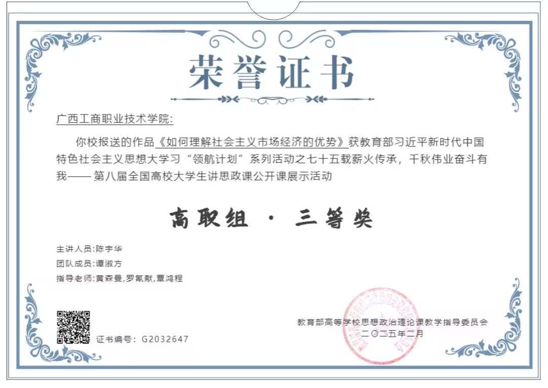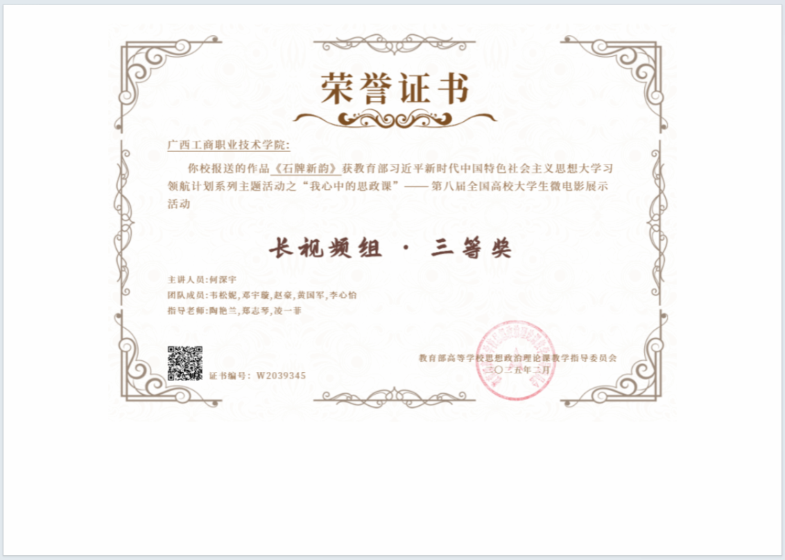 由教育部高等學(xué)校思想政治理論課教學(xué)指導(dǎo)委員會(huì)主辦的“七十五載薪火傳承,千秋偉業(yè)奮斗有我”——第八屆全國高校大學(xué)生講思政課公開課展示活動(dòng)和“我心中的思政課”——第八屆全國高校大學(xué)生微電影展示活動(dòng)圓滿結(jié)束,我校馬克思主義學(xué)院黃森曼老師團(tuán)隊(duì)指導(dǎo)的《如何理解社會(huì)主義市場經(jīng)濟(jì)的優(yōu)勢》和陶艷蘭老師團(tuán)隊(duì)指導(dǎo)的《石牌新韻》2個(gè)作品入圍國賽,經(jīng)過角逐,均榮獲三等獎(jiǎng)。這是我校第三年獲此榮譽(yù)。