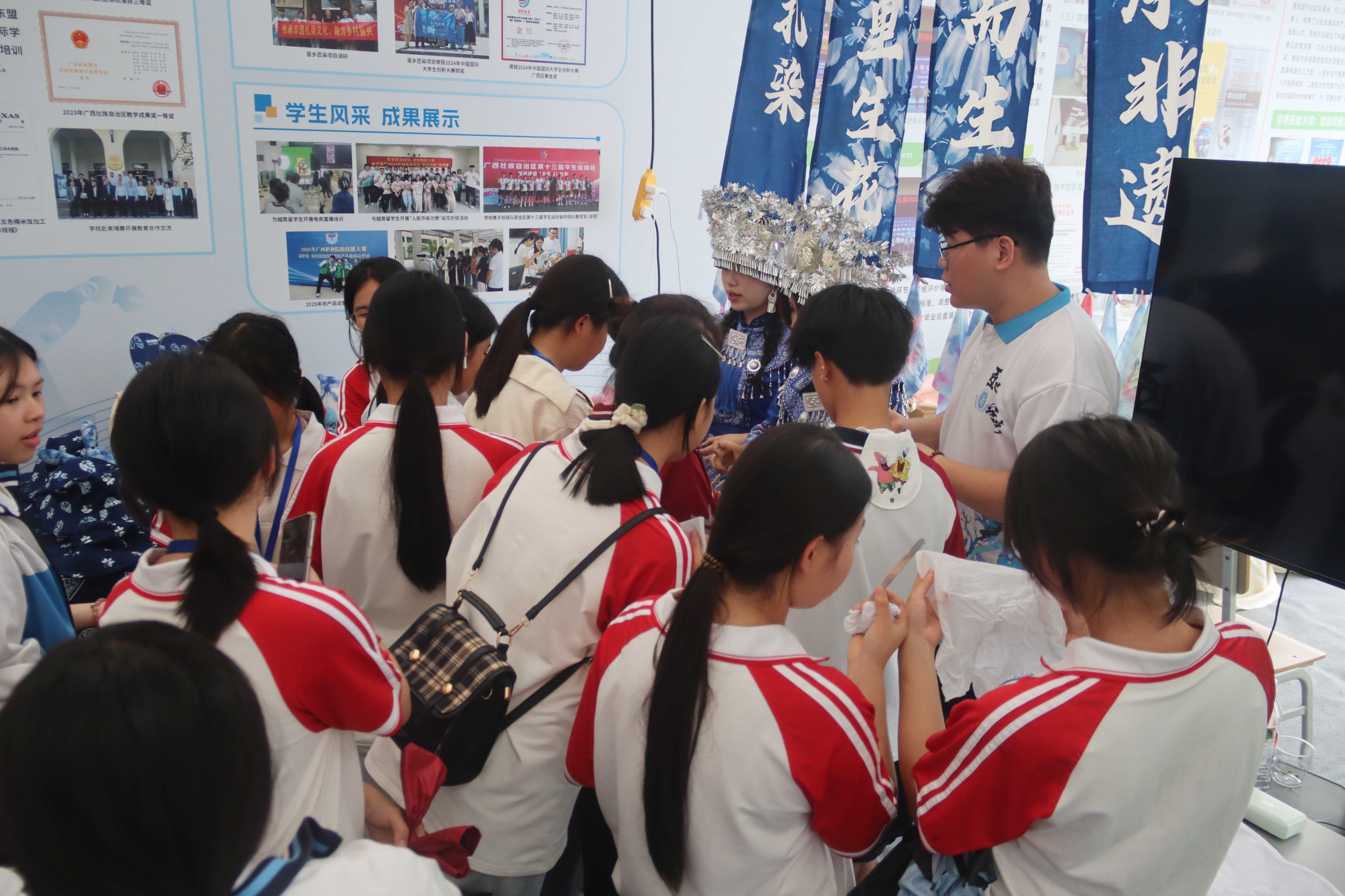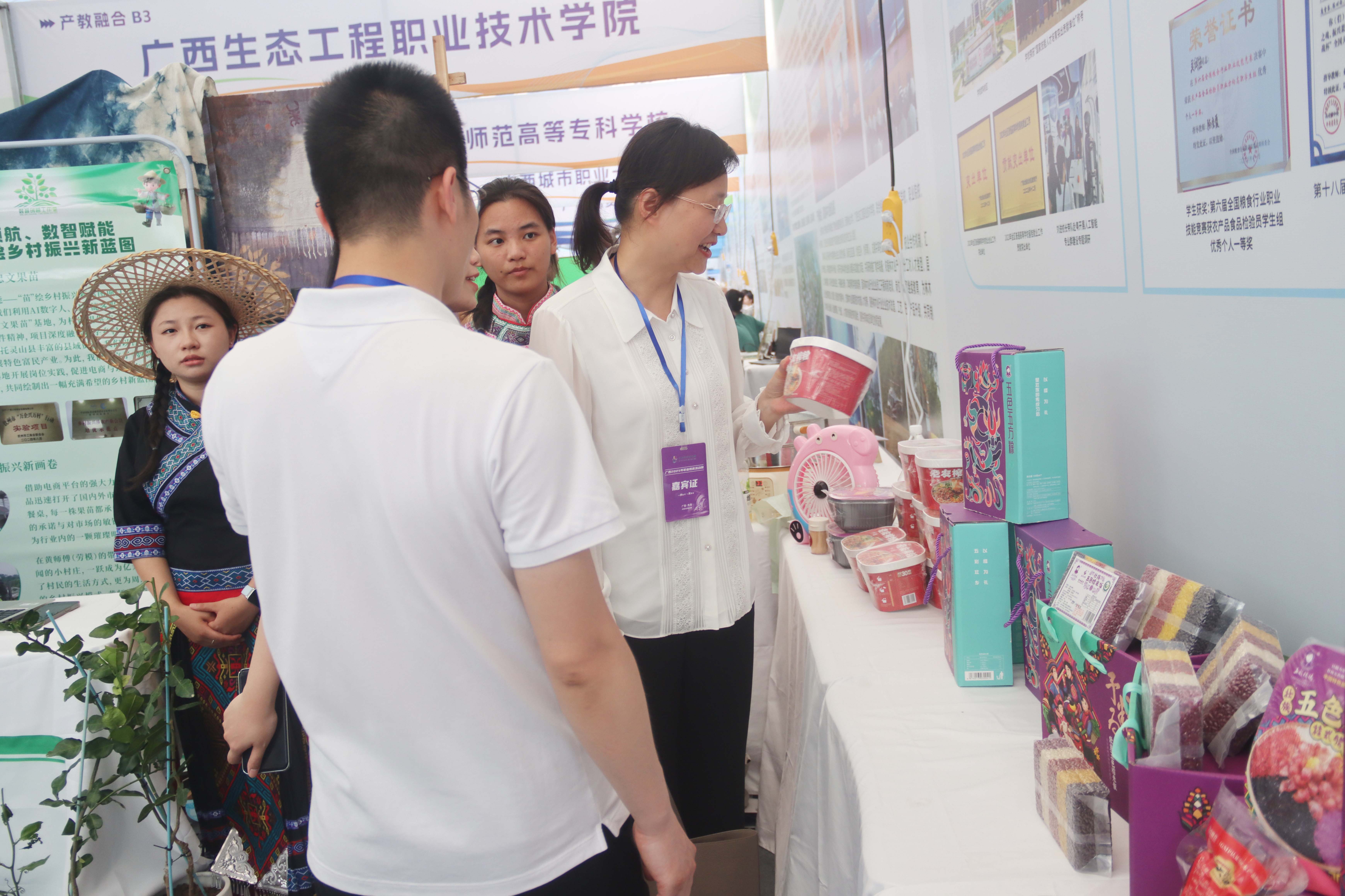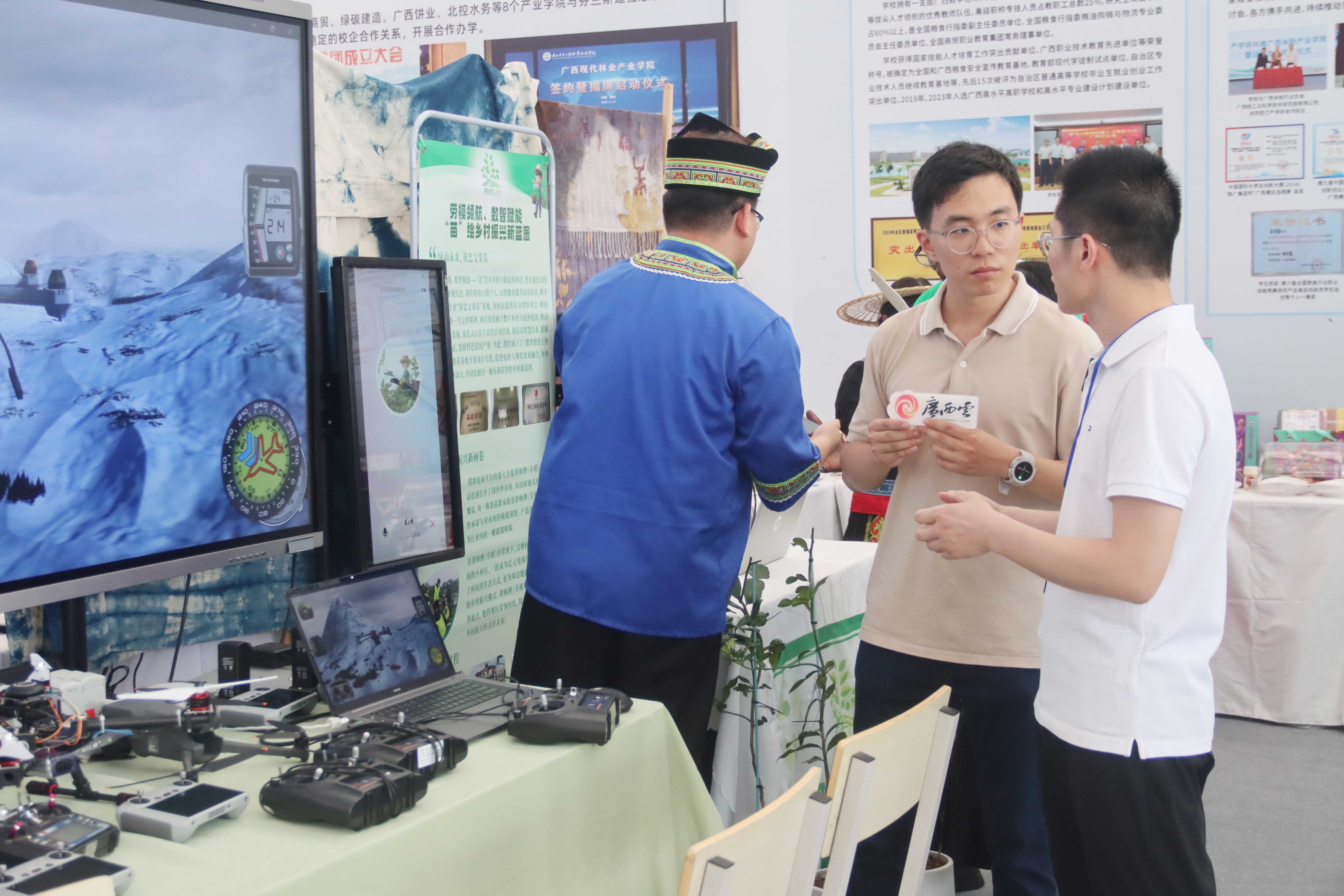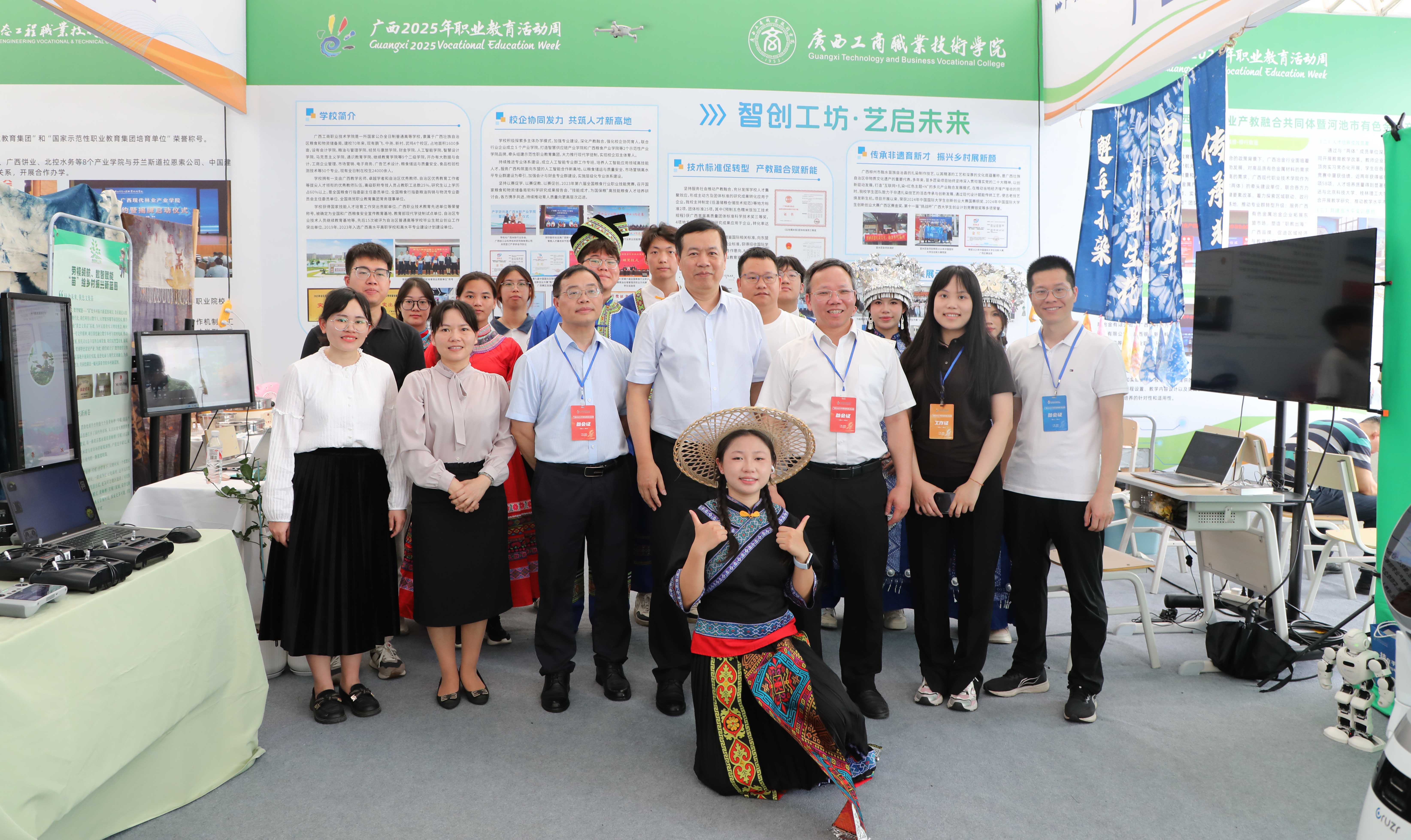 我校展位設(shè)在產(chǎn)教融合展區(qū),以“智創(chuàng)工坊·藝啟未來”為主題,通過展板、實(shí)物、交互活動的形式,以“產(chǎn)教融合、育訓(xùn)結(jié)合”為特色,展示學(xué)校扎根八桂大地,服務(wù)區(qū)域經(jīng)濟(jì),融合傳統(tǒng)非遺技藝與前沿科技應(yīng)用,展現(xiàn)我校職業(yè)教育賦能廣西產(chǎn)業(yè)發(fā)展的創(chuàng)新實(shí)踐。
