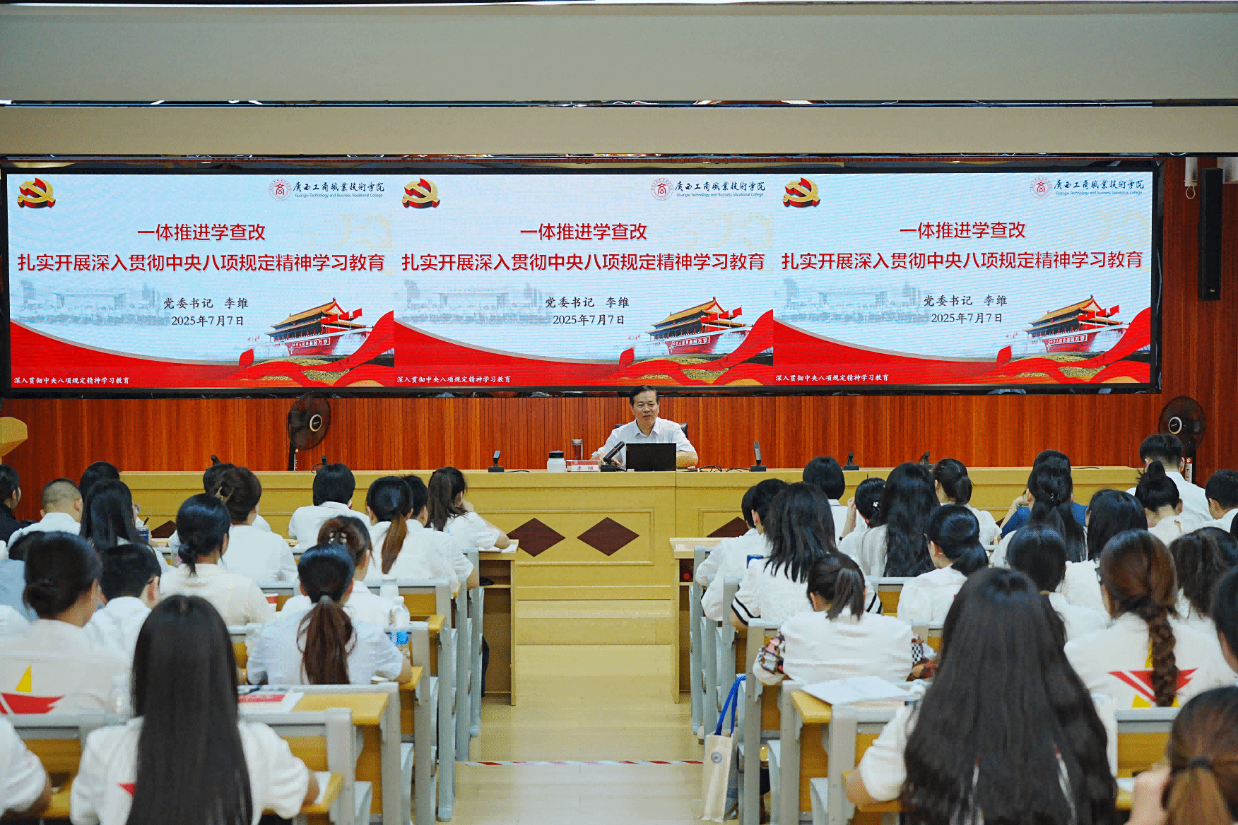 2025年7月7日,學(xué)校黨委書記李維應(yīng)邀為第八期青馬班學(xué)員講授開班第一課,學(xué)校黨委副書記安仲文主持,馬克思主義學(xué)院、校團(tuán)委、各二級(jí)學(xué)院團(tuán)委負(fù)責(zé)人及教師、第八期青馬班學(xué)員參加開班第一課。