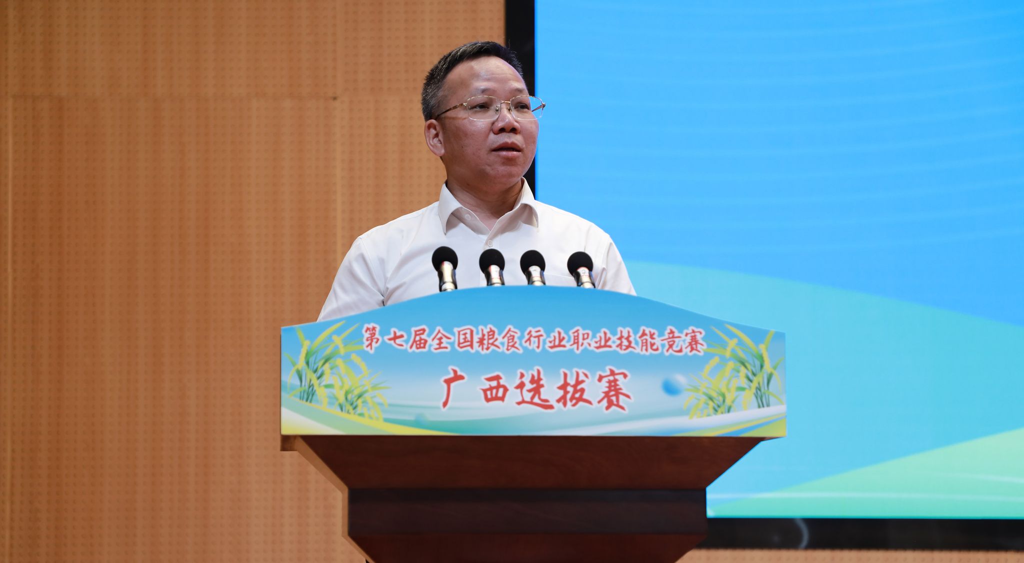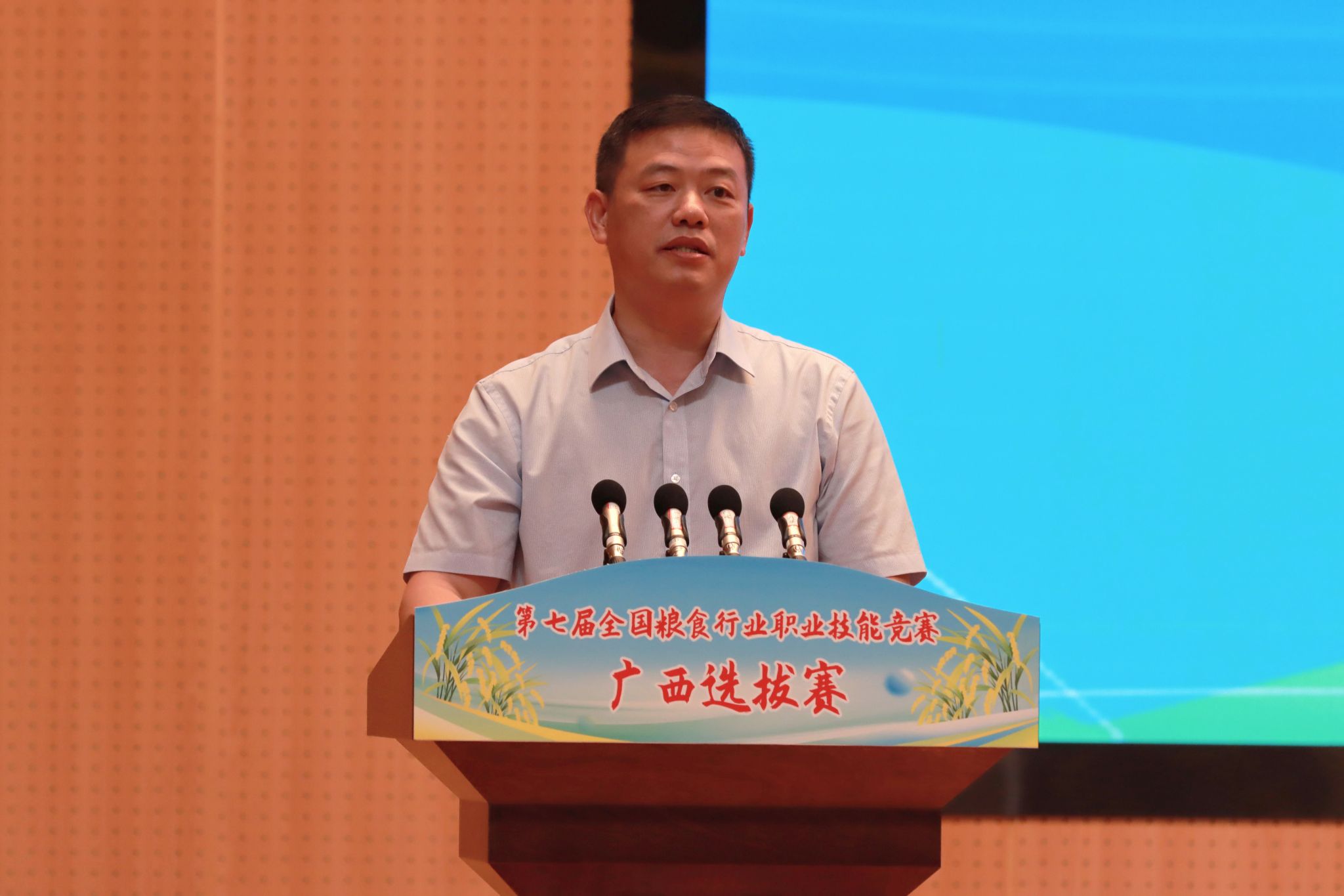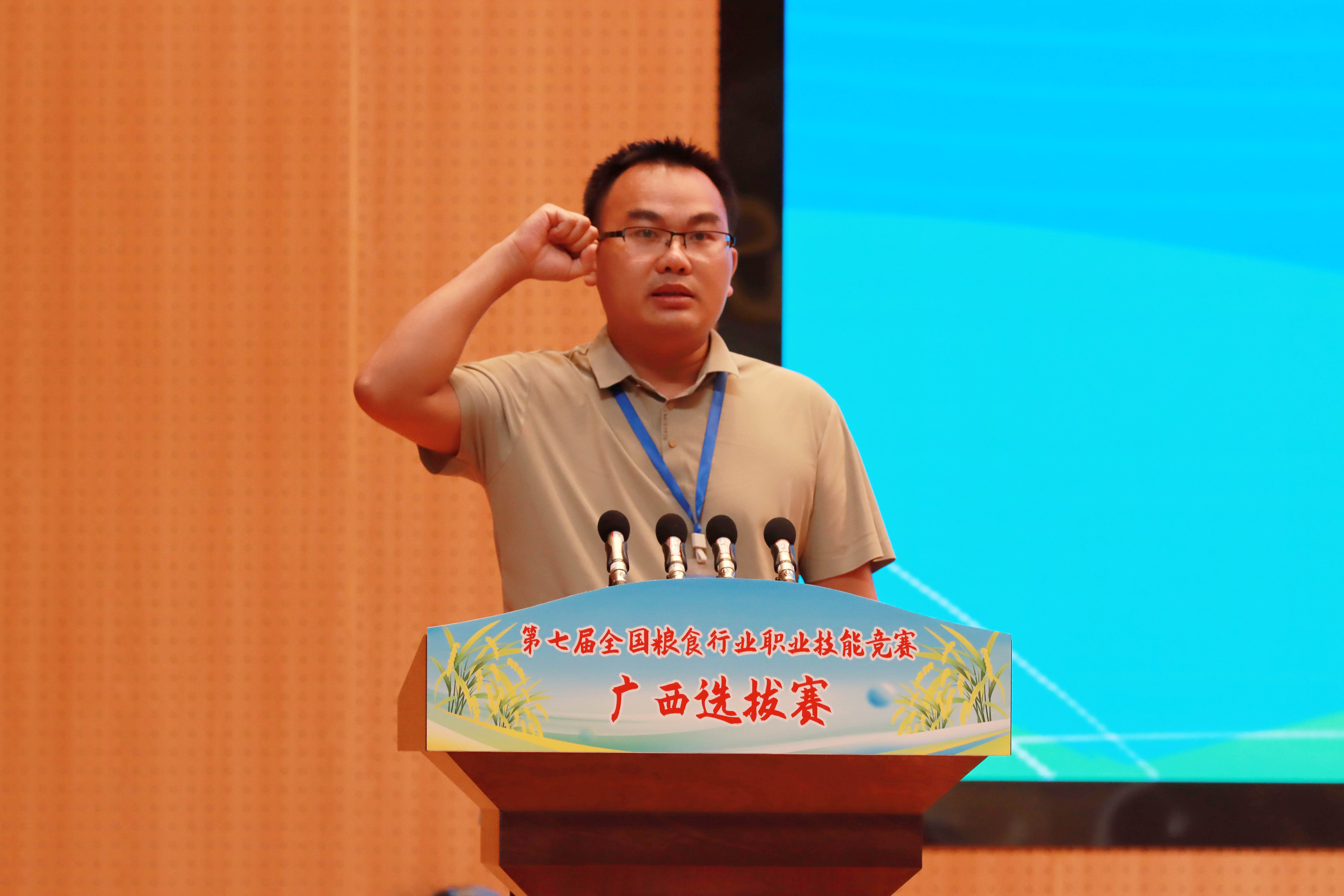 廣西壯族自治區(qū)糧食和物資儲備局黨組成員、副局長覃家權(quán)在開幕式上講話,他表示,糧食技能人才是保障國家糧食安全的重要支撐,是推動糧食產(chǎn)業(yè)高質(zhì)量發(fā)展的關(guān)鍵力量。自治區(qū)糧食和物資儲備局深入貫徹習近平總書記重要指示要求,以筑牢糧食安全屏障、全面推進廣西糧食行業(yè)高質(zhì)量發(fā)展為己任,大力實施“人才興糧”、“科技興糧”戰(zhàn)略,在人才培養(yǎng)體系、人才隊伍結(jié)構(gòu)、人才創(chuàng)新能力、人才管理體制等方面取得顯著成效。本次廣西選拔賽既是為全國糧食行業(yè)職業(yè)技能競賽遴選優(yōu)秀選手的重要一環(huán),更是激勵全區(qū)糧食行業(yè)廣大職工及相關(guān)專業(yè)的學生“學知識、練技能、強素質(zhì)”的有效載體。希望全體參賽選手以飽滿的熱情、昂揚的斗志、精湛的技藝,全身心投入比賽,充分展示廣西糧食人愛崗敬業(yè)、精益求精、追求卓越的精神風貌,達到“以賽促學、以賽促練、以賽促干”的目的。希望全區(qū)各級糧儲部門以本次競賽為契機,進一步加強技能人才隊伍建設,加快建設一支知識型、技能型、創(chuàng)新型勞動者大軍,為夯實廣西糧食安全根基,守住管好“八桂糧倉”提供堅實的人才保障。