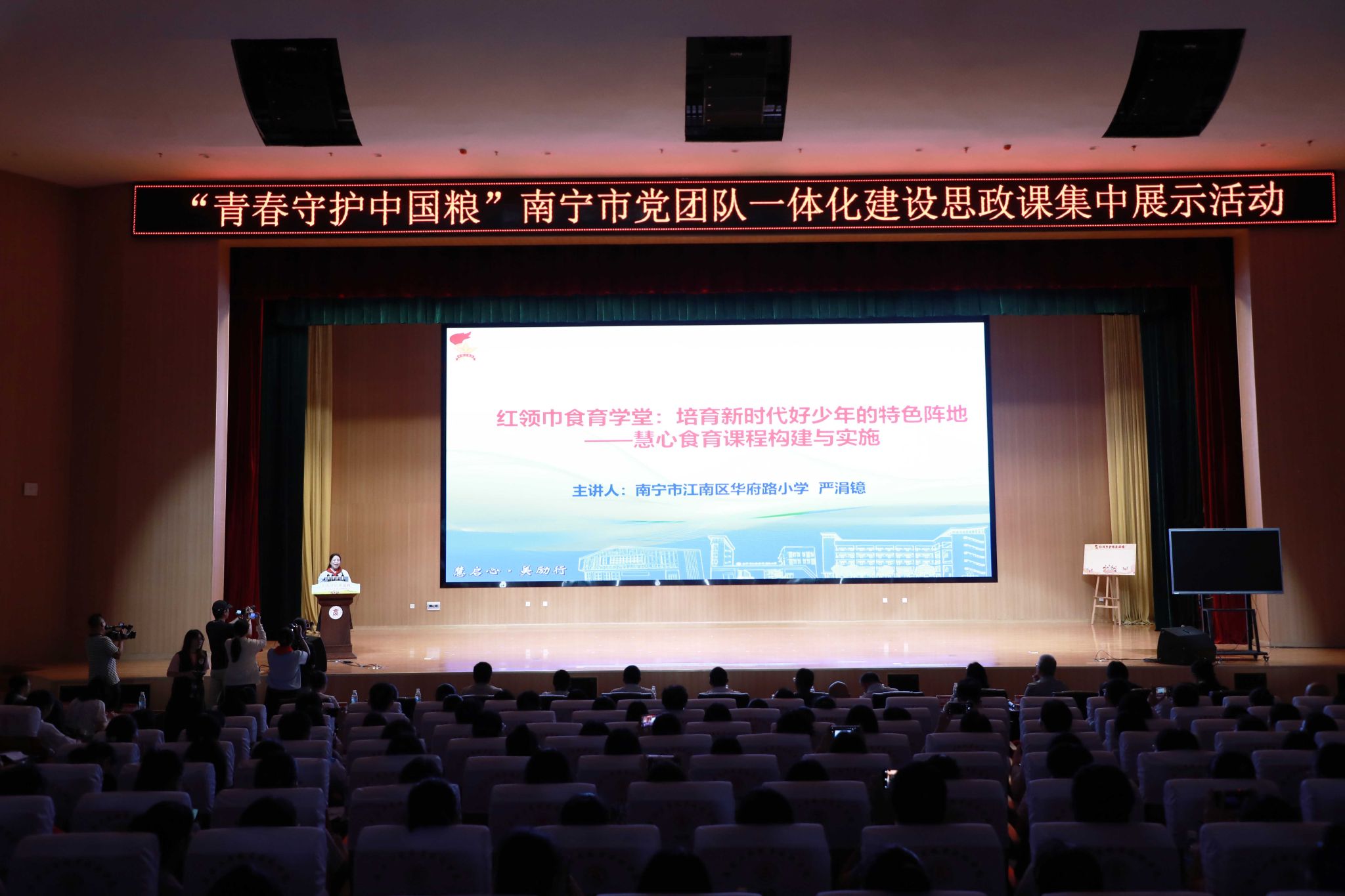 展示環(huán)節(jié)內(nèi)容豐富、形式多樣。大學(xué)生與中小學(xué)生同臺演繹,分別呈現(xiàn)了極具感染力的節(jié)目。我校師生們深情演唱了原創(chuàng)歌曲《青禾少年》,青春昂揚(yáng)的歌詞展現(xiàn)青年一代扎根大地、守護(hù)糧安的堅定信念;南寧市江南區(qū)華府路小學(xué)的少先隊員們表演了融合民族傳統(tǒng)文化與健康理念的壯瑤醫(yī)藥繡球操,展現(xiàn)出陽光活潑、團(tuán)結(jié)向上的精神風(fēng)貌。華府路小學(xué)校長、少工委主任嚴(yán)涓鐿系統(tǒng)介紹了該校通過構(gòu)建“少先隊活動+五位一體”食育體系,在提升學(xué)生政治認(rèn)同、勞動意識和健康習(xí)慣方面取得的顯著成效。