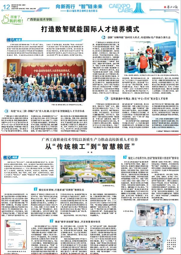 2025年9月15日,《廣西日報》第22屆東博會和峰會亮點(diǎn)展示專版刊登學(xué)校校長劉進(jìn)署名文章,標(biāo)題為:《從“傳統(tǒng)糧工”到 “智慧糧匠”:廣西工商職業(yè)技術(shù)學(xué)院以新質(zhì)生產(chǎn)力推動高校新質(zhì)人才培養(yǎng)》,全文如下: