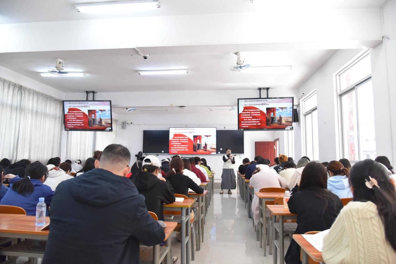 在專題授課環(huán)節(jié),陳寧春以《深入學習黨的二十屆四中全會精神 勇?lián)笆逦濉睍r代使命》為題,結合中國發(fā)展鮮活實踐與學生身邊可感可知的現(xiàn)實案例,從四大維度展開講解:一是“十四五”時期我國在經(jīng)濟、科技、民生等領域取得的標志性重大成就;二是“十五五”時期錨定高質(zhì)量發(fā)展、推進中國式現(xiàn)代化的重大戰(zhàn)略意義;三是黨的二十屆四中全會為國家未來發(fā)展擘畫的宏偉藍圖與實踐路徑;四是回顧學校高職辦學以來在“十四五”期間實現(xiàn)的跨越式發(fā)展與突破。陳寧春深入淺出解讀了政策內(nèi)涵,引導學生將個人成長與國家發(fā)展、時代需求緊密結合,深刻領會全會精神,樹立勇?lián)笆逦濉笔姑呢熑我庾R。