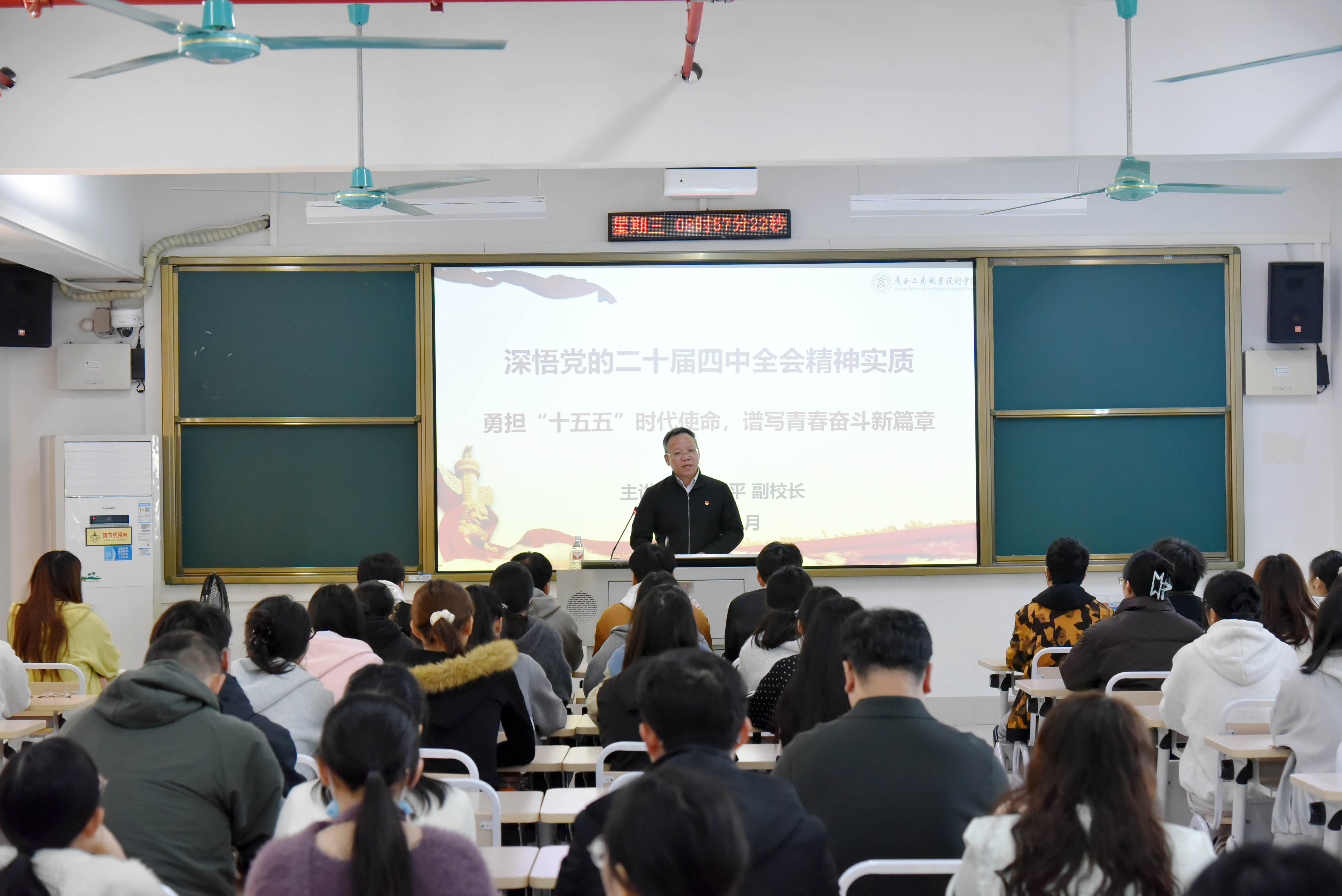 在專題授課中,闕勇平副校長以《深悟黨的二十屆四中全會精神實質(zhì) 勇?lián)笆逦濉睍r代使命,譜寫青春奮斗新篇章》為題,從四個方面展開系統(tǒng)講解:一是回顧“十四五”時期我國發(fā)展取得的重大成就;二是闡釋“十五五”時期經(jīng)濟社會發(fā)展的重大意義;三是解讀黨的二十屆四中全會擘畫的未來藍圖;四是說明黨的二十屆四中全會精神對大學生成長成才的現(xiàn)實指引。授課過程中,他緊扣時代脈搏,將政策精神與社會現(xiàn)實相結(jié)合,用通俗易懂的語言幫助同學們準確把握全會精神的核心要義,引導大家把人生理想融入強國建設、民族復興偉業(yè)的時代洪流,更加堅定勇?lián)笆逦濉睍r代使命的信念與責任。