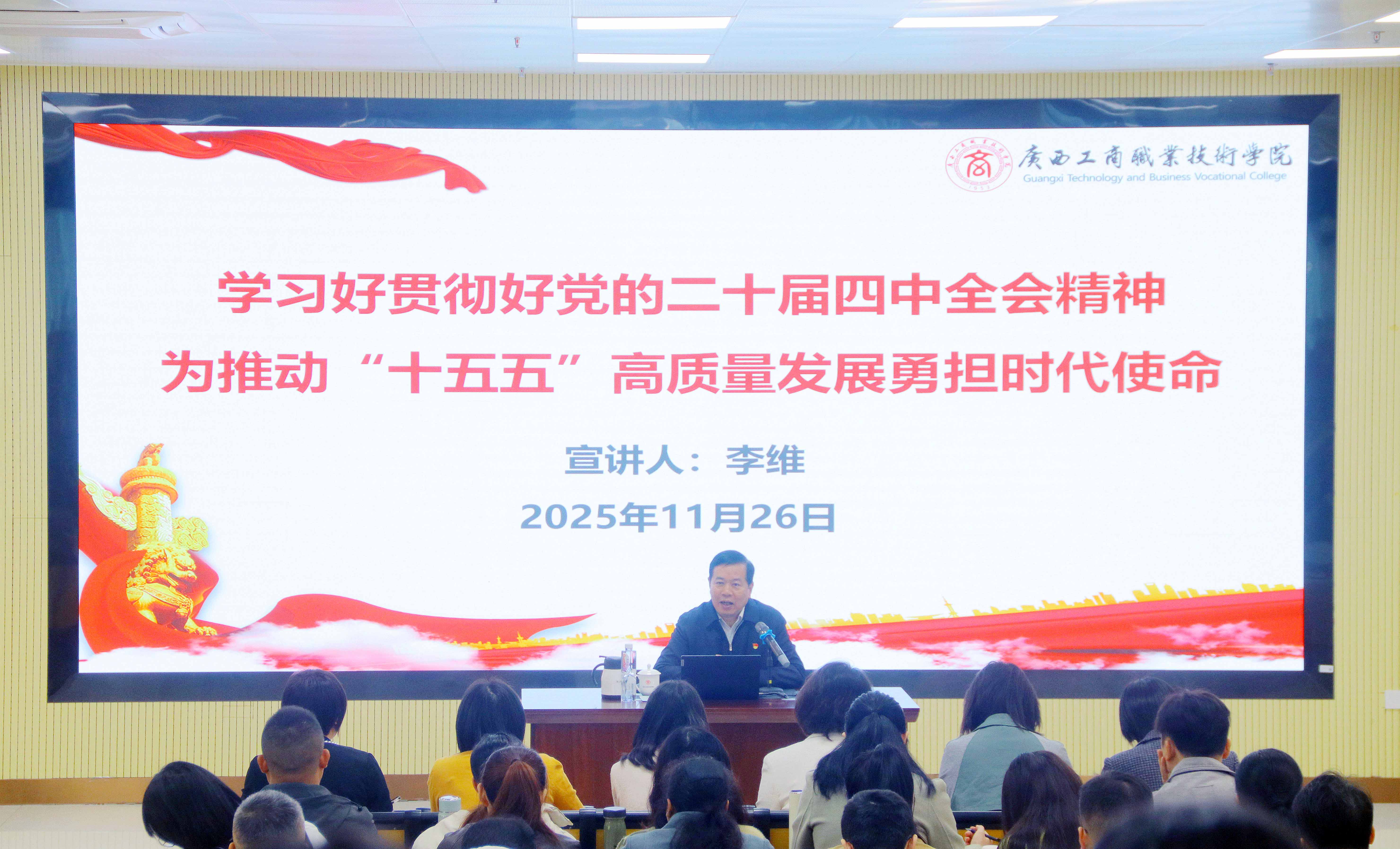 為深入學(xué)習(xí)貫徹黨的二十屆四中全會精神,準(zhǔn)確把握黨中央對“十五五”時期發(fā)展的戰(zhàn)略部署,統(tǒng)一思想、凝聚共識,2025年11月26日,學(xué)校黨委書記李維在武鳴校區(qū)為師生宣講黨的二十屆四中全會精神。黨委組織部(學(xué)院人事處)、黨委宣傳部黨支部黨員代表、馬克思主義學(xué)院教師代表、學(xué)校青馬班及青年學(xué)生代表200多人參加。宣講活動由黨委宣傳部部長廖顯圖主持。