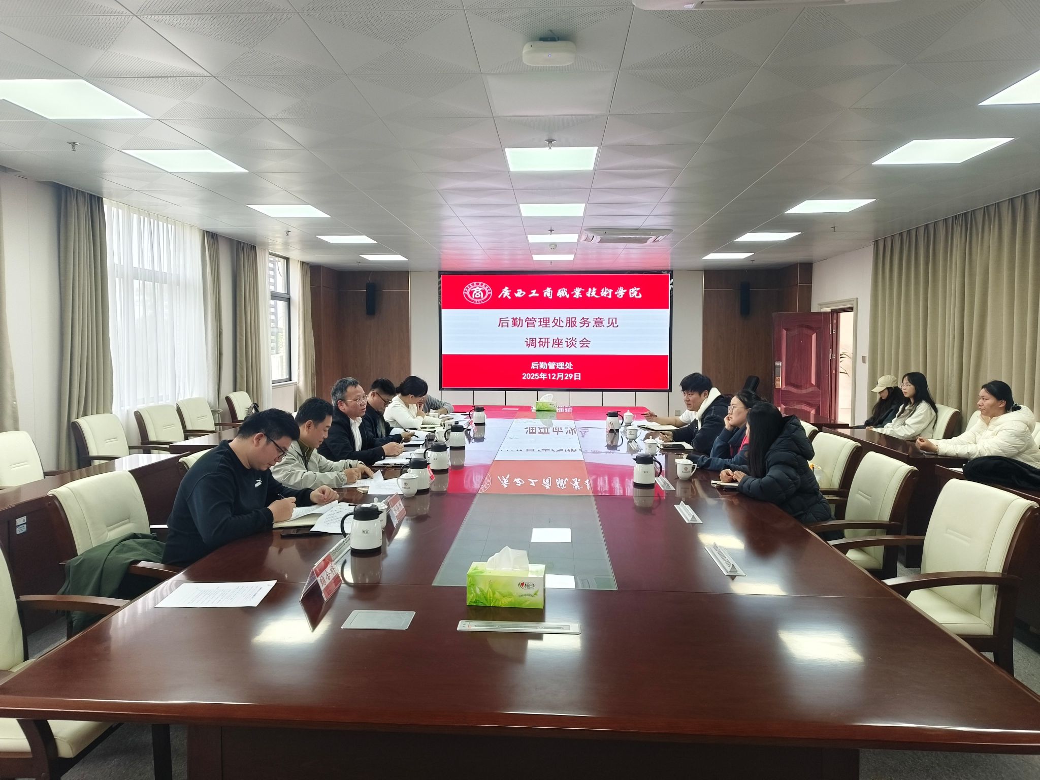 為持續(xù)提升后勤服務保障水平,廣泛聽取師生意見建議,12月29日,學校副校長闕勇平在武鳴校區(qū)主持召開后勤服務意見調(diào)研座談會。后勤管理處處長林昆榮、安全穩(wěn)定工作處副處長譚爵璽、后勤相關科室工作人員,以及來自經(jīng)貿(mào)與康旅學院、財金學院的師生代表共同參加了會議。