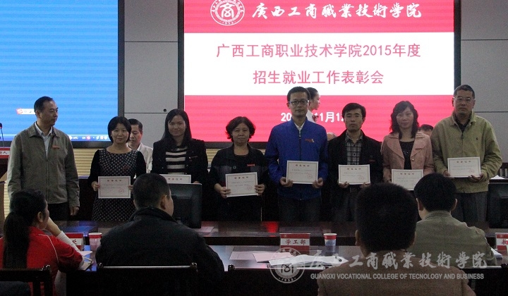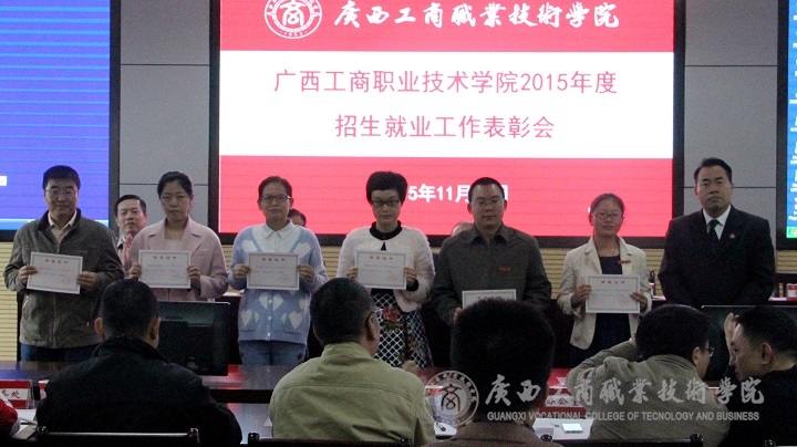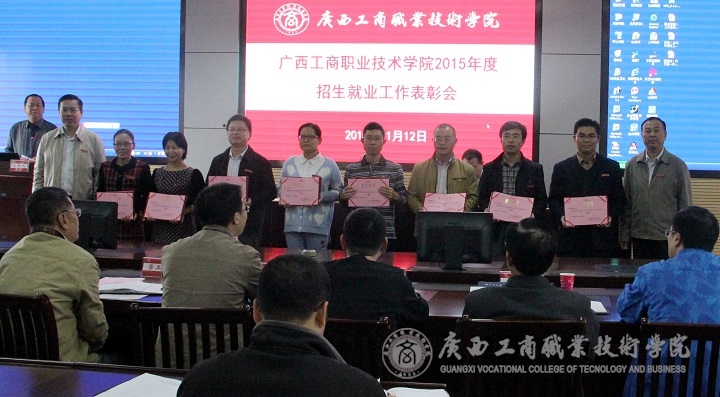 在2015年招生就業(yè)工作表彰會上學(xué)院副院長李仕欽宣讀了招生就業(yè)工作獎勵文件,隨后學(xué)院領(lǐng)導(dǎo)為獲獎部門集體及個人頒發(fā)獎狀。學(xué)院李維副院長做招生工作小結(jié),指出2015年招生圓滿結(jié)束,生源充足,質(zhì)量提升并希望我院能再接再勵,再創(chuàng)輝煌業(yè)績。學(xué)院黨委副書記蒙啟成發(fā)表就業(yè)工作小結(jié),指出我院畢業(yè)生就業(yè)形勢大好,但也提出希望全體教職工認識到畢業(yè)生就業(yè)工作對學(xué)院發(fā)展的重要性,加強就業(yè)指導(dǎo)服務(wù),把我院畢業(yè)生就業(yè)工作推向一個新的工作平臺。