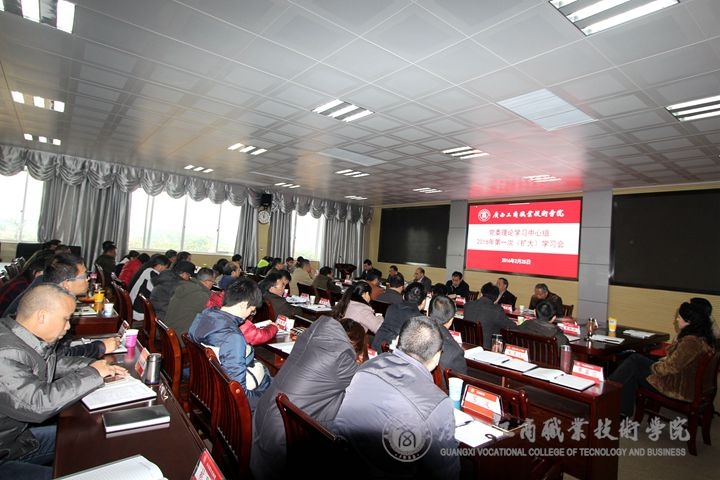 ? ? ? ? ?2016年2月25日上午,我院黨委理論學習中心組2016年第一次(擴大)學習會在校本部視頻會議室召開。學院黨委書記覃武云主持會議,并做中心發(fā)言。院長陳杰、黨委副書記、紀委書記蒙啟成、副院長李仕欽、副院長李維、副廳級調研員黃永蓬參加學習會,并做了發(fā)言。學院中層以上領導干部參加了會議。