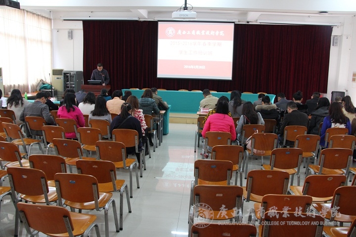 2016年2月28日15:00,我院在校本部教學(xué)樓2145報(bào)告廳舉辦2015—2016學(xué)年寒假學(xué)生工作培訓(xùn)班。學(xué)院黨委副書記蒙啟成、各系黨總支書記、系學(xué)工副主任、就業(yè)副主任、全體輔導(dǎo)員及學(xué)工處全體人員參加了培訓(xùn),由黨委學(xué)工部副部長張居設(shè)主持。