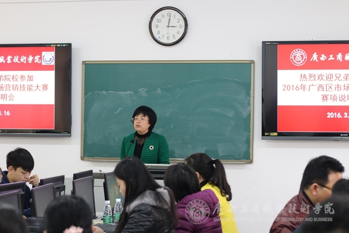 2016年3月16日14時(shí), 2016年廣西職業(yè)院校技能大賽高職組市場營銷技能賽項(xiàng)說明會(huì)在我院本部教學(xué)樓2511教室舉行。學(xué)院教務(wù)科研處處長韋勝強(qiáng)教授、經(jīng)管系譚波主任、高職研究所副所長葉桂中教授和來自全區(qū)大部分參賽院校領(lǐng)隊(duì)和指導(dǎo)教師、營銷技能競賽技術(shù)支持單位代表共40多人參加了賽項(xiàng)說明會(huì)。