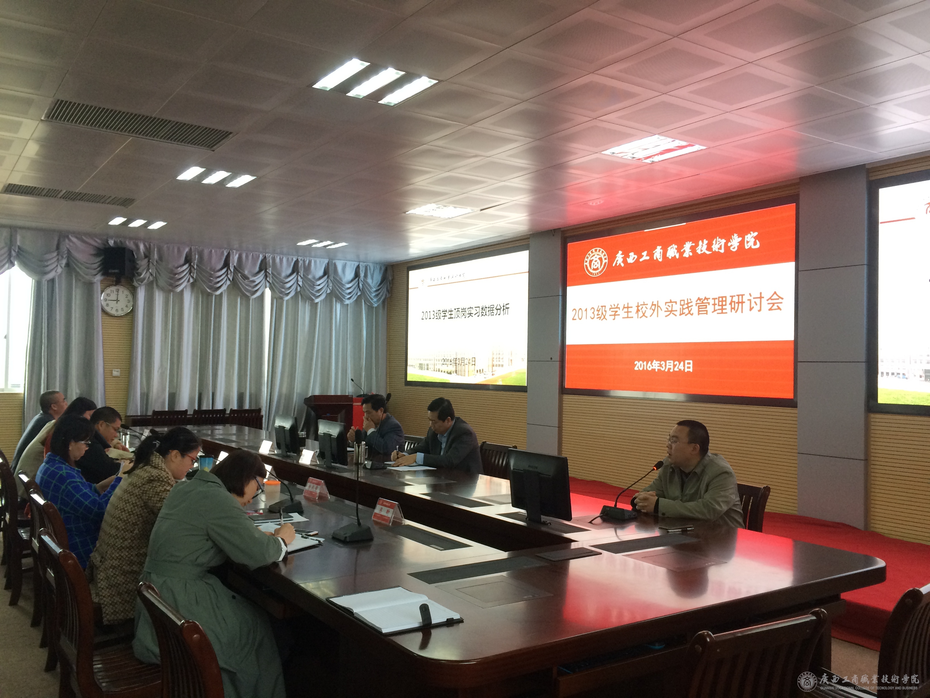 2016年3月24日上午,教務(wù)科研處處長韋勝強(qiáng)在校本部2119會(huì)議室主持召開了2013級學(xué)生校外實(shí)踐管理研討會(huì),學(xué)院李維副院長、黨委學(xué)生工作部及各系部相關(guān)負(fù)責(zé)人,教務(wù)科研處有關(guān)人員出席了會(huì)議。