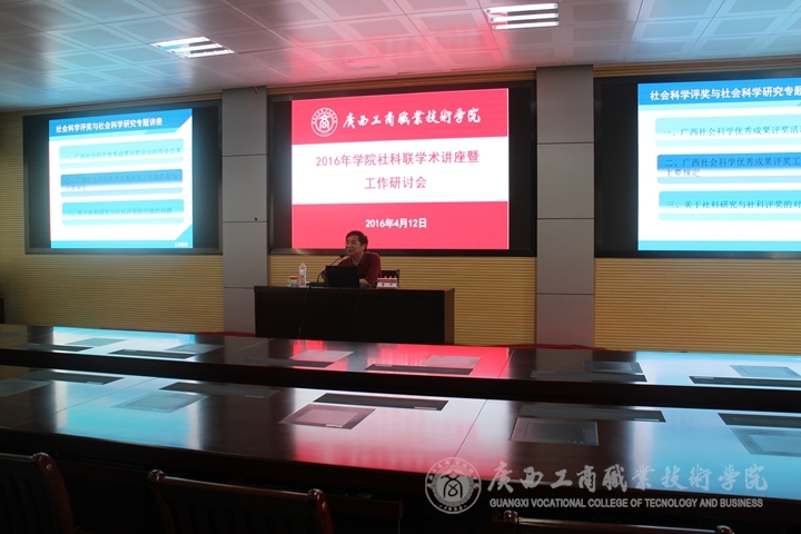 為進(jìn)一步加強(qiáng)師資隊(duì)伍建設(shè),規(guī)范我校社會(huì)科學(xué)研究及評(píng)獎(jiǎng)申報(bào)工作程序,加強(qiáng)我校哲學(xué)社會(huì)科學(xué)項(xiàng)目暨廣西第十四次社會(huì)科學(xué)優(yōu)秀成果獎(jiǎng)申報(bào)組織工作,全面提高我校教師的教學(xué)、科研學(xué)術(shù)能力以及科研成果轉(zhuǎn)化工作水平,2016年4月12日下午15:00,我院在校本部2119會(huì)議室舉辦了“社科聯(lián)學(xué)術(shù)講座暨工作研討會(huì)”,學(xué)院社科聯(lián)特別邀請(qǐng)了自治區(qū)社科聯(lián)黨組成員、副主席曹平研究員為我院教師作了題為《社會(huì)科學(xué)評(píng)獎(jiǎng)與社會(huì)科學(xué)研究》的專題講座。講座由我院社科聯(lián)主席、學(xué)院黨委副書(shū)記兼紀(jì)委書(shū)記蒙啟成主持,會(huì)計(jì)系、經(jīng)管系、財(cái)信系、社科部、公共部、學(xué)工部等六個(gè)教學(xué)系部及相關(guān)行政部門(mén)的近100名教師聆聽(tīng)了講座。