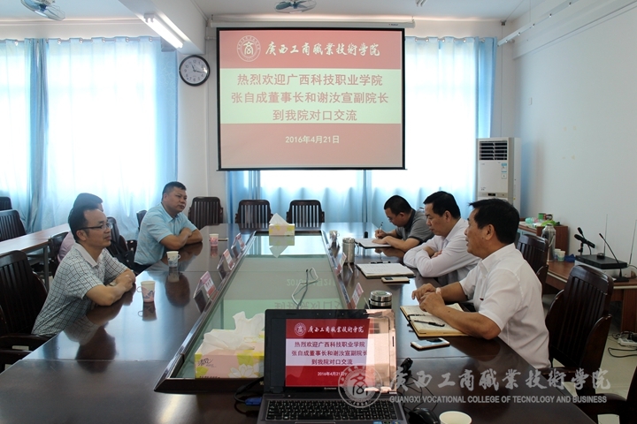 2016年4月21日上午,廣西科技職業(yè)技術(shù)學(xué)院張自成董事長、謝汝宣副院長和吳先夏副院長一行到我院進(jìn)行對口交流。我校李維副院長、教務(wù)科研處處長韋勝強(qiáng)和教務(wù)處相關(guān)同志參與會議。