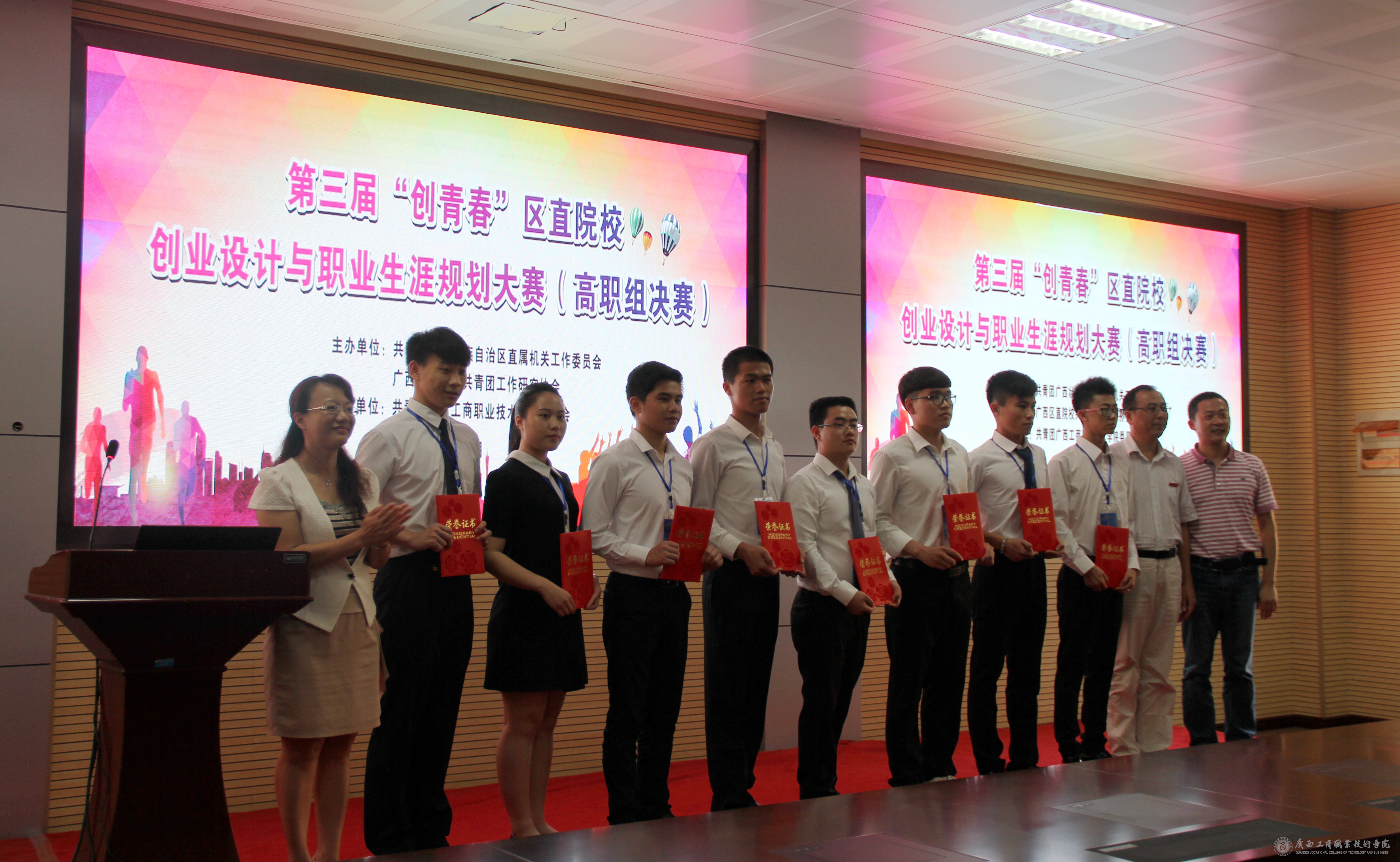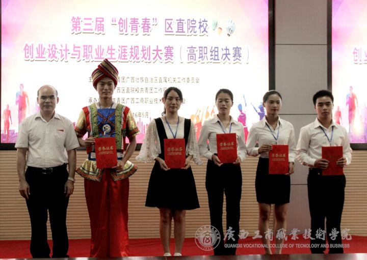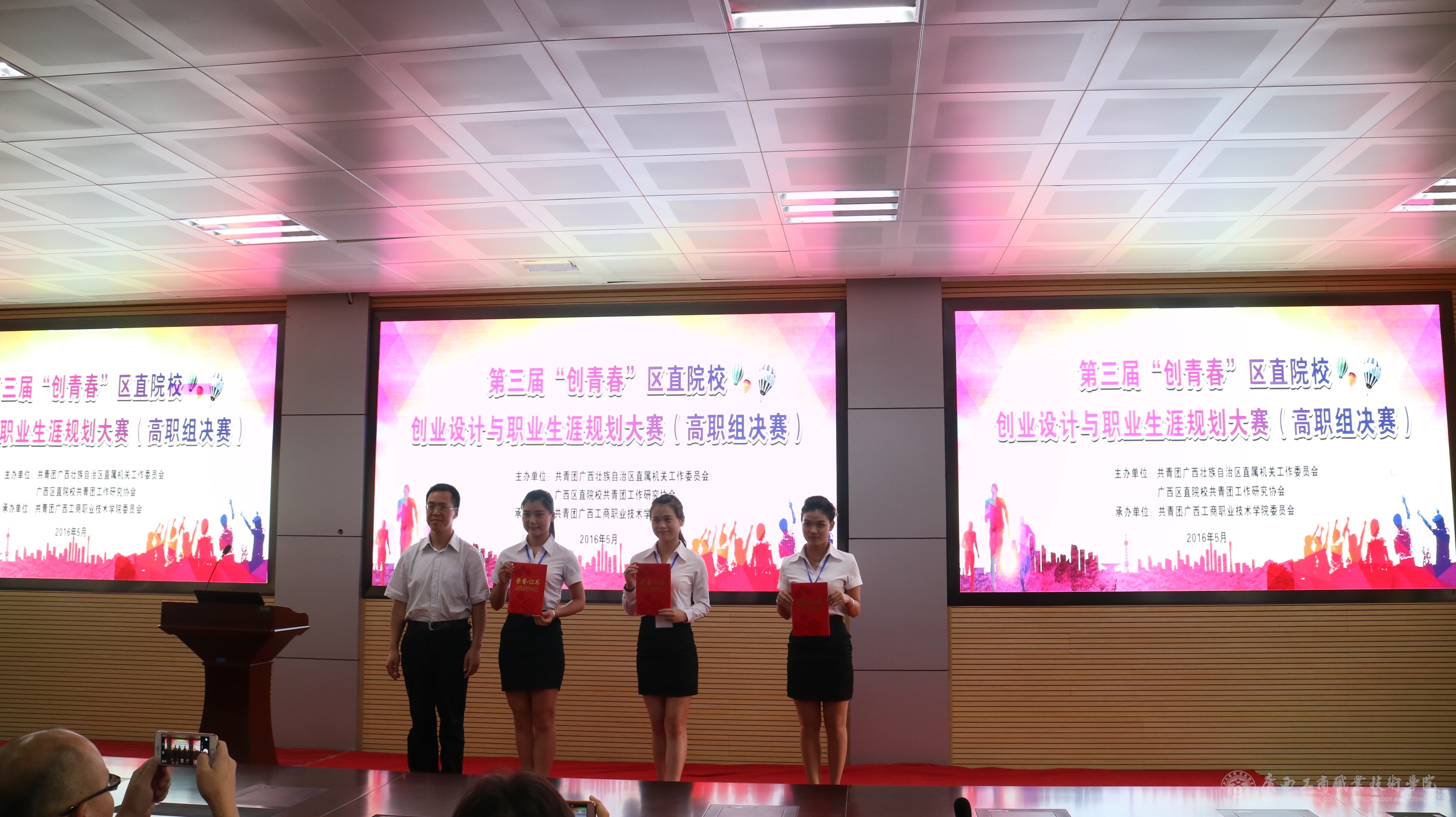 至決賽尾聲,由共青團廣西區(qū)委副書記劉玄啟和我院黨委書記覃武云分別給榮獲一等獎、二等獎的選手頒獎,我院黨委副書記、紀委書記蒙啟成、自治區(qū)直屬機關團工委書記謝萍、共青團廣西區(qū)委學校部部長鐘聲宇為榮獲三等獎的選手頒獎。2016年第三屆“創(chuàng)青春”區(qū)直院校、創(chuàng)業(yè)設計與職業(yè)生涯規(guī)劃大賽決賽圓滿落下帷幕!