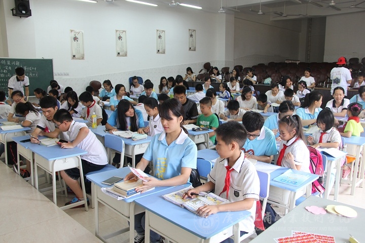??????? 隨著輕快的下課鈴聲,小朋友們來到教室,準備上一堂特殊的課程。然而,可愛的小朋友們并沒有想象中的調(diào)皮。初次與“小老師”們接觸,大部分小朋友們顯得靦腆和害羞,經(jīng)過交談后才顯得放松,教室內(nèi)歡笑聲也逐漸多了起來。有的“小老師”在指導做作業(yè)、有的輔助預習、有的在復習。急促的下課鈴聲響起,一節(jié)課很快就結(jié)束了,小朋友們收拾好沉重的書包與“老師”們道別便匆匆離開了。支教的圓滿落幕,周末也隨之來臨。揮手之間告別的不止是小朋友們,還有那緊張的學習日。