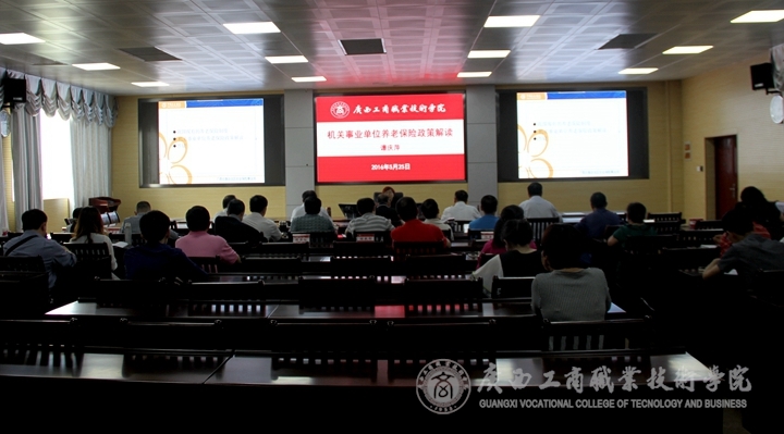 2016年5月25日下午,我院在校本部2119會(huì)議室舉辦機(jī)關(guān)事業(yè)單位養(yǎng)老保險(xiǎn)政策解讀專(zhuān)題講座。學(xué)院黨委書(shū)記覃武云、院長(zhǎng)陳杰、黨委副書(shū)記蒙啟成、副院長(zhǎng)李仕欽、副院長(zhǎng)李維、學(xué)院中層以上領(lǐng)導(dǎo)及業(yè)務(wù)部門(mén)工作人員參加了本次講座。本次講座由自治區(qū)社保局基本養(yǎng)老保險(xiǎn)經(jīng)辦管理處主任科員譚慶萍主講。