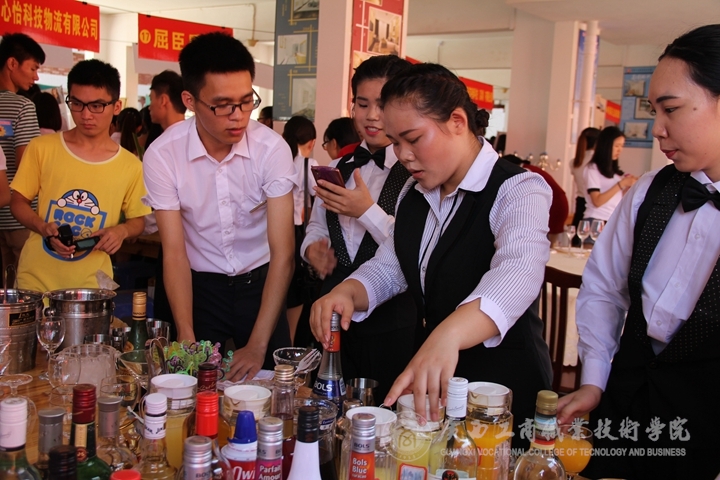 就業(yè)洽談會(huì)上,還安排了廣商院系列教學(xué)成果展演。酒店管理專業(yè)學(xué)生的西餐擺臺(tái)、中餐擺臺(tái)、餐巾花折疊、調(diào)酒表演等表演既展示出學(xué)生嫻熟的專業(yè)技能,也體現(xiàn)學(xué)院嚴(yán)謹(jǐn)專業(yè)的教學(xué)。同時(shí),會(huì)計(jì)系學(xué)生在學(xué)生公寓架空層展示點(diǎn)鈔、珠算的技能,嫻熟的珠算打法,撥動(dòng)的算珠敲擊著算盤框,聲聲連珠陣陣響,學(xué)生低頭認(rèn)真點(diǎn)鈔,速度手法技巧令人折服。除此之外,書法與攝影作品展示,字跡工整,現(xiàn)場(chǎng)書法,吸引觀眾踴躍嘗試,題詞留下筆墨。學(xué)生各社團(tuán)紛紛展示才藝,各展特色。