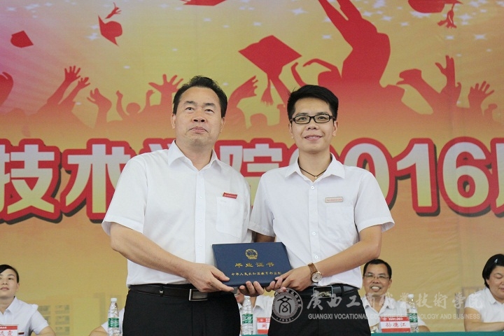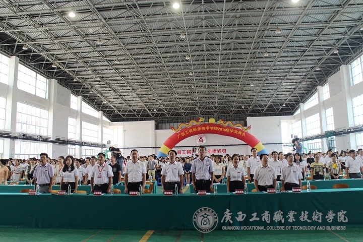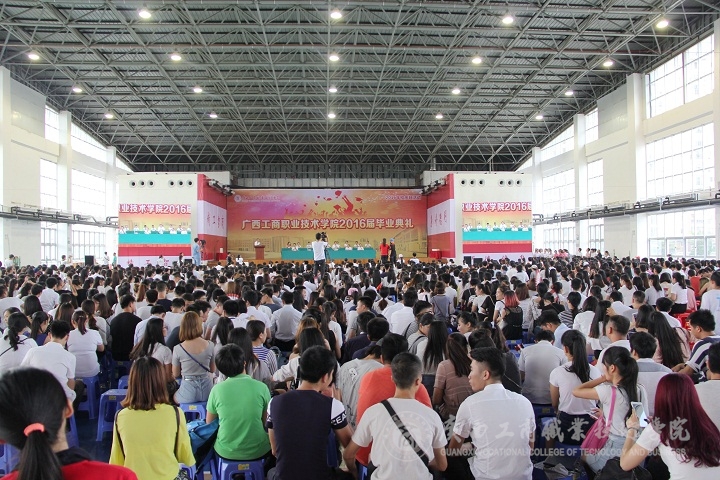 ??????? 又是紫荊花開時(shí),又是一年畢業(yè)季,“學(xué)海浩瀚,憑誰鵬飛起航。光華歲月,任我青春飛揚(yáng)?!庇茡P(yáng)激蕩的《廣商院之歌》不時(shí)在鵬飛路上空回蕩,燦爛的陽光輝映著廣商院美麗的校園,文體館內(nèi)陣陣清風(fēng)撲面而來。2016年6月26日下午,廣西工商職業(yè)技術(shù)學(xué)院2016屆畢業(yè)典禮在校本部文體館二樓隆重舉行。學(xué)院黨委書記覃武云、院長陳杰等校領(lǐng)導(dǎo)、學(xué)院各部門主要負(fù)責(zé)人出席,2016屆2200多位畢業(yè)生及班主任參加。畢業(yè)典禮由蒙啟成副書記主持。