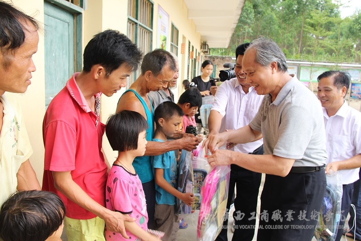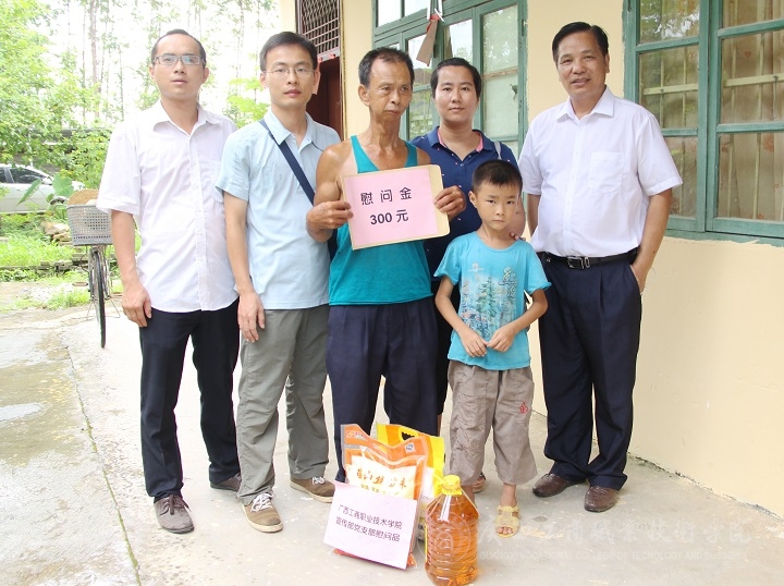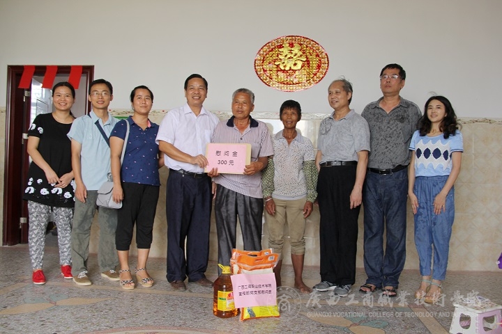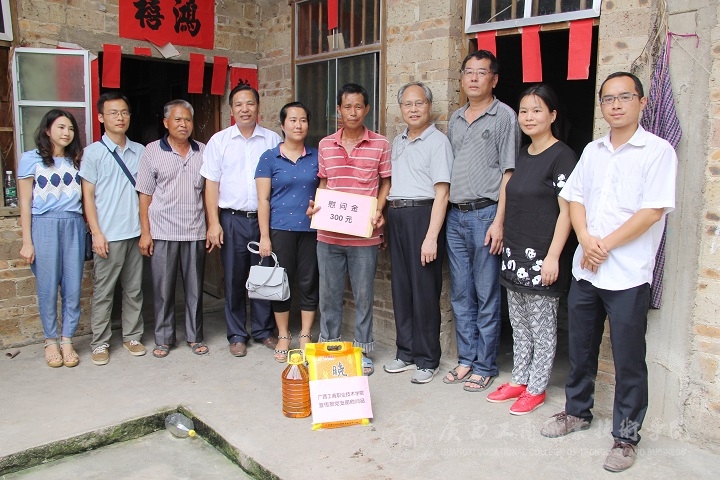 2016年7月8日,學院黃永蓬副廳級調研員率黨委宣傳部部長韋勝強、后勤管理處處長付光、宣傳部黨員教師等一行五人前往陸川縣看望駐四樂村第一書記羅北戰(zhàn)同志,走訪慰問該村老黨員、困難黨員、困難群眾,并為當地小學困難學子捐獻學習用品。