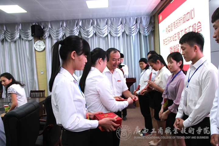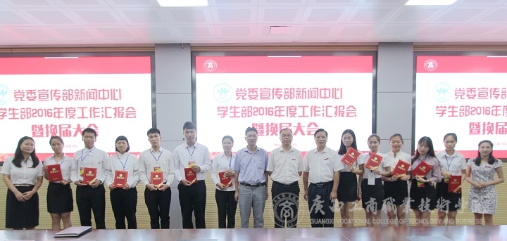 會議最后,由蒙啟成副書記為粟蘭惠、梁禮娜、李蓉榮等新聞中心獲得廣商院2015-2016年“優(yōu)秀記者”的同學(xué)頒發(fā)證書;韋勝強部長和林雯副部長分別為新聞中心獲得廣商院“新文化建設(shè)貢獻突出者”、“防艾微電影貢獻者”的同學(xué)頒發(fā)證書,韋勝強部長還現(xiàn)場為新聞中心14級全體成員頒發(fā)了聘書。