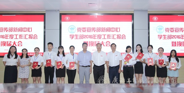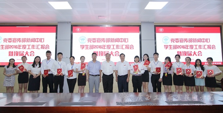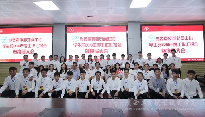 2016年7月12日下午五點,我院在校本部2119視頻會議室舉辦“新聞中心學(xué)生部2016年度工作匯報會暨換屆大會?!睂W(xué)院黨委副書記蒙啟成、黨委宣傳部部長韋勝強、現(xiàn)教中心主任、黨委宣傳部副部長林雯、新聞中心指導(dǎo)老師、新聞中心學(xué)生部全體成員參加了本次大會。會議由新聞中心播主部宋珮瑤主持。