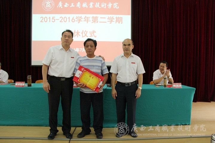 儀式上,黨委書記覃武云和院長(zhǎng)陳杰為退休教師張善湛和龐國(guó)文頒發(fā)榮休證書和榮休紀(jì)念品,并和他們合影留念。
