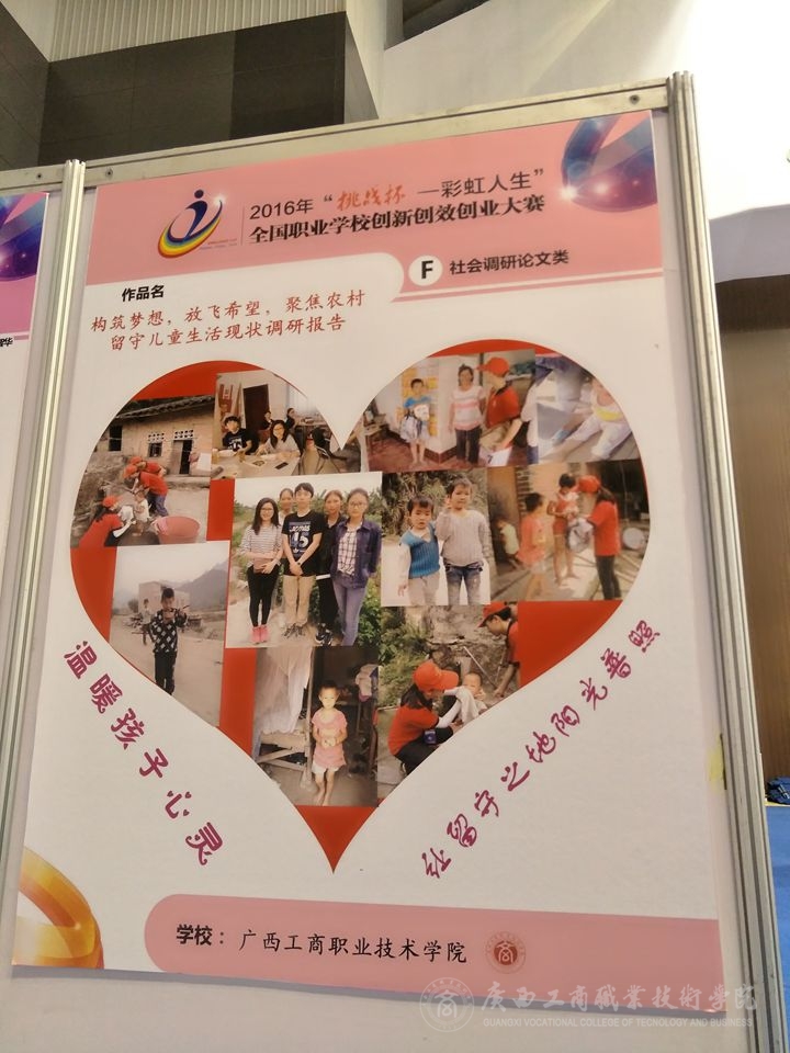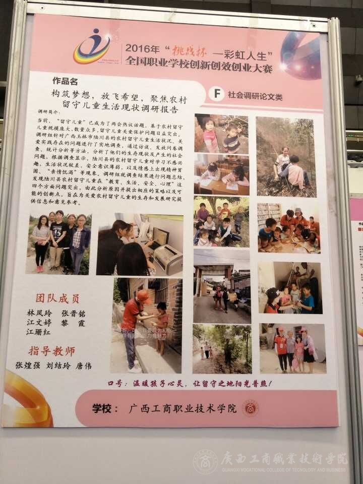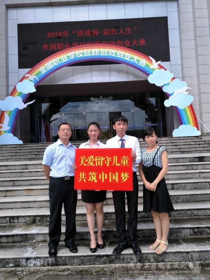 由團(tuán)中央、教育部、人社部、中國科協(xié)、全國學(xué)聯(lián)、省政府共同主辦,團(tuán)省委、省教育廳、省人社廳、省科協(xié)、省學(xué)聯(lián)、福州市政府、福建師范大學(xué)共同承辦的2016年“挑戰(zhàn)杯——彩虹人生”全國職業(yè)學(xué)校創(chuàng)新創(chuàng)效創(chuàng)業(yè)大賽總決賽于今年8月11-14日在福建福州隆重拉開帷幕。我院的參賽作品《構(gòu)筑夢(mèng)想,放飛希望,聚焦農(nóng)村留守兒童生活現(xiàn)狀調(diào)研報(bào)告——以廣西玉林市陸川縣為例》(指導(dǎo)教師:張煌強(qiáng)、劉結(jié)玲、唐偉)在全區(qū)初賽和全國復(fù)賽中脫穎而出,代表廣西社會(huì)調(diào)研論文類進(jìn)入了全國總決賽。8月10日,我院參賽代表隊(duì)在學(xué)院團(tuán)委副書記趙婷老師的帶領(lǐng)下,前往福建福州參加今年的總決賽。