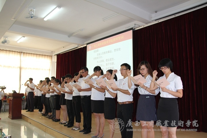 儀式上,覃武云書記宣讀2016年新進教師名單,學院黨委組織部(人事處)部長蔣百平帶領新進教師進行了莊嚴地宣誓,做出了一名廣商院教師的鄭重承諾。