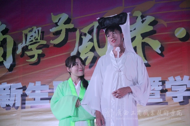 隨后由院大學(xué)生藝術(shù)團(tuán)舞蹈隊(duì)為大家?guī)?lái)精彩并富有激情活力的舞蹈《RHYTHM TA》,院大學(xué)生藝術(shù)團(tuán)戲劇社演繹幽默詼諧的小品《大話西游》,逗得觀眾哈哈大笑。晚會(huì)進(jìn)行的正精彩,天空不作美下起了小雨,但并未熄滅在座各位觀眾的熱情。學(xué)院領(lǐng)導(dǎo)即使沒(méi)有撐傘也未受雨的影響,依然注目臺(tái)上演員的精彩表現(xiàn)。院大學(xué)生藝術(shù)團(tuán)禮儀隊(duì)帶來(lái)的古今時(shí)裝秀帶領(lǐng)同學(xué)們領(lǐng)略各個(gè)朝代服飾的變遷及風(fēng)采。接著兄弟院校廣西農(nóng)業(yè)職業(yè)技術(shù)學(xué)院藝術(shù)團(tuán)國(guó)標(biāo)隊(duì)為我們帶來(lái)灑脫自如的國(guó)標(biāo)舞《神話》,把現(xiàn)場(chǎng)氣氛推向一個(gè)小高潮,引發(fā)觀眾們的陣陣尖叫聲。由院大學(xué)生藝術(shù)團(tuán)戲劇社以及16級(jí)新生合作表演的小品《白蛇前傳》,首先出場(chǎng)的是白娘子與小青的蛇身,劇情一轉(zhuǎn),許仙悲情一喚,“白姑娘~” 全場(chǎng)新生熱烈回應(yīng)“哎~”。現(xiàn)場(chǎng)一片沸騰。緊接著由16級(jí)新生代表表演的彈唱歌曲《小幸運(yùn)》,歌曲在吉他的伴奏下,回憶青春片段,引起全場(chǎng)共鳴,觀眾們情不自禁地低聲合唱,紛紛開啟閃光燈高舉手機(jī)隨著節(jié)奏輕輕晃動(dòng),現(xiàn)場(chǎng)變成一片由閃光燈組成的美麗星海。