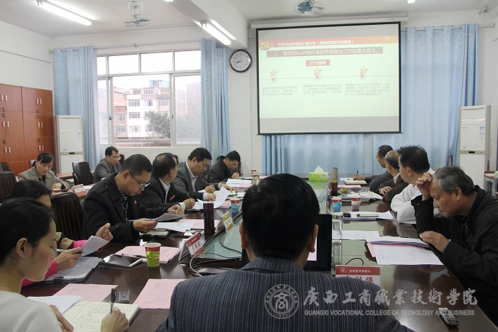 本次會(huì)議圍繞“學(xué)習(xí)全國(guó)高校思想政治工作會(huì)議精神”展開,會(huì)議學(xué)習(xí)了全國(guó)高校思想政治工作會(huì)議精神,討論研究了《廣西工商職業(yè)技術(shù)學(xué)院科級(jí)管理人員管理辦法(試行)》,聽(tīng)取了學(xué)院工會(huì)作2016年度教代會(huì)工作安排匯報(bào)和2017年度教代會(huì)工作安排匯報(bào),聽(tīng)取了黨委組織部(學(xué)院人事處)作2016年度教職工年度考核、評(píng)優(yōu)方案匯報(bào),聽(tīng)取了黨委辦公室作學(xué)院黨委2016年度工作總結(jié)、2017年度工作思路匯報(bào),聽(tīng)取了學(xué)院辦公室作學(xué)院2016年度工作總結(jié)、2017年度工作思路匯報(bào)。