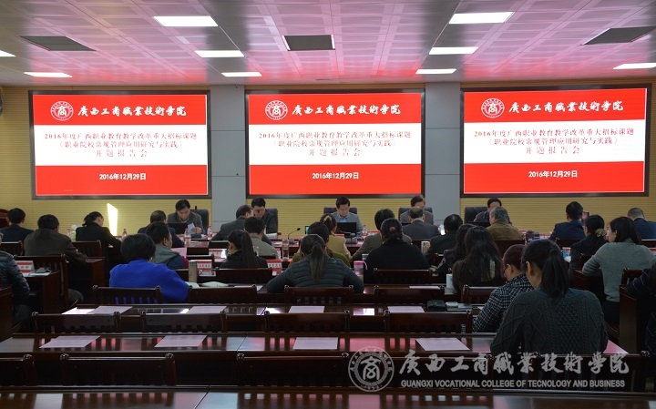 2016年12月29日下午,我院召開2016年度廣西職業(yè)教育教學(xué)改革重大招標(biāo)課題開題評議報告會,由學(xué)院院長、首席專家陳杰教授主持的“職業(yè)院校常規(guī)管理應(yīng)用研究與實踐”課題順利通過開題論證。