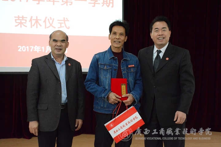 儀式上,蒙啟成副書記宣讀了2016年下半年退休教師名單,即周艷、陸尚平、陳可林三位老師。學(xué)院黨委書記覃武云和院長陳杰為退休教師代表陳可林頒發(fā)榮休證書和榮休紀(jì)念品,并合影留念。