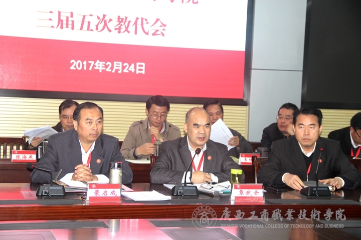 2017年2月24日,我院在校本部報(bào)告廳召開學(xué)院三屆五次教代會(huì),學(xué)院黨委書記覃武云、黨委副書記、院長(zhǎng)陳杰及學(xué)院領(lǐng)導(dǎo)班子成員、教代會(huì)代表參加了會(huì)議,學(xué)校中層干部、離退休代表列席會(huì)議,全體教職工列席了第一階段會(huì)議。